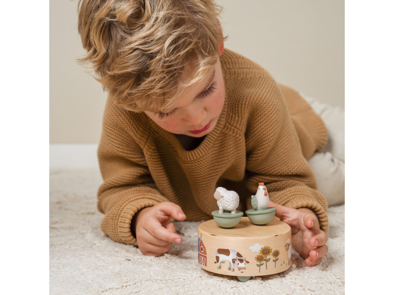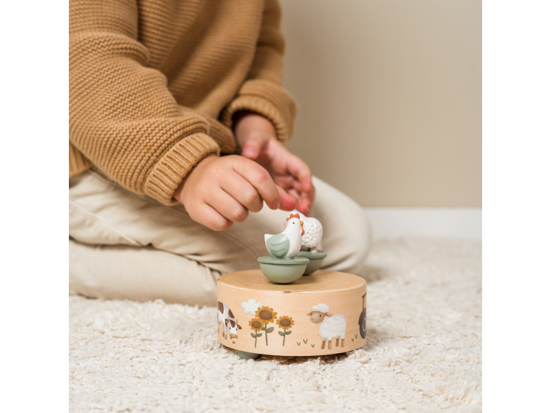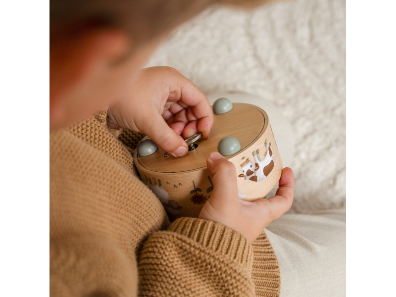 Hudební box v krásném dřevěném provedení s ilustracemi motivů ze života na farmě hraje po natažení melodii „Old MacDonald Had a Farm“, zatímco ovečka a slepička ladně tančí. Hudební box je součástí designové kolekce Little Dutch Farma, ve které najdete dekorativní doplňky do dětského pokoje, ložní prádlo, dřevěné a plyšové hračky i jídelní doplňky pro dětské stolování. Rozměry: 26 x 9 x 4,1 cm Vhodné pro děti od 12 měsíců.