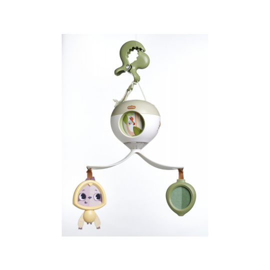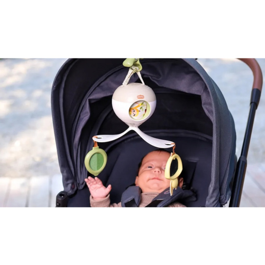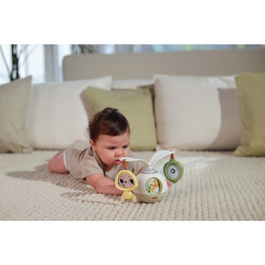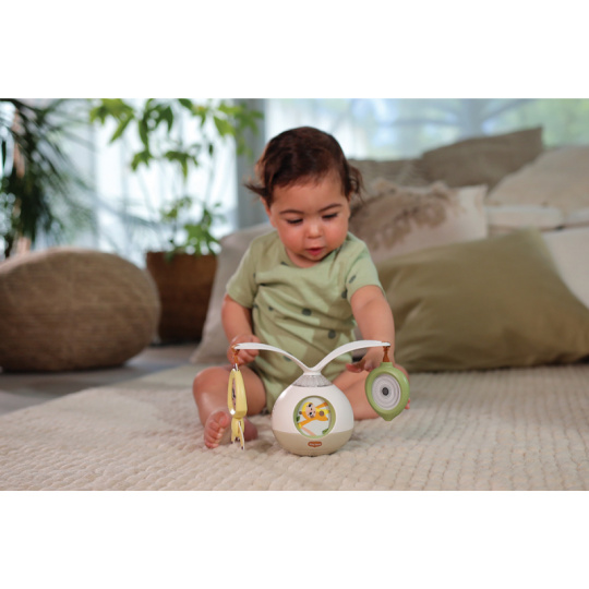 Unikátní hudební box s hudbou, světýlky a otočnými rameny podněcuje dítě ke hře na bříšku. Pro malého kojence, který tráví většinu dne i noci ležením na zádech, je důležité, aby trávil několikrát denně čas ležením na bříšku a takzvaným “pasením koníčků”. Poloha na bříšku přináší děťátku jiný pohled na svět a posiluje krční a zádové svaly, které později umožňují dítěti začít se přetáčet, lézt a sedět bez opory. Hudební box nabízí dítěti aktivity, které ho udrží déle spokojené v poloze na bříšku. Na ramenou, otáčejících se o 360°, upoutá pozornost dítěte zavěšené zrcátko i výrazné hologramové obrázky. Obrázky zvířátek se pohybují i v okénku hudebního boxu. Hračka umožňuje nastavit automatické přehrávání až 30 minut melodií spolu se světýlky. Další variantou je pouštění hudby a světýlek dotykem, dítě se tak učí příčině a následku. Hračku je možné používat i bez hudby. Kromě postavení hračky na zem pro hru na bříšku je možné ji s pomocí klipu zavěsit např. na kočárek. Rozměry: 18,8 x 9,6 x 13,3 cm Baterie 3xAA 1,5V nejsou součástí balení. Vhodné pro děti od narození.