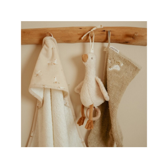 Závěsná plyšová husička v sobě skrývá natahovací hudební box s příjemnou ukolébavkou, která vaše miminko uklidní a pomůže mu usnout. Husičku snadno zavěsíte poblíž postýlky. Závěsná husa je součástí designové kolekce hraček a doplňků Little Dutch Newborn Naturals. Jedná se o dekorativní předmět, umístěte jej mimo dosah dítěte. Rozměry: 29 x 10 x 7 cm Složení: 100% polyester Výplň je vyrobena ze 100% recyklovaného polyesteru s certifikací GRS (Global Recycled Standard). Údržba: pouze otírejte vlhkým hadříkem Vhodné pro děti od narození.