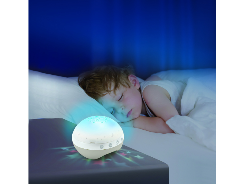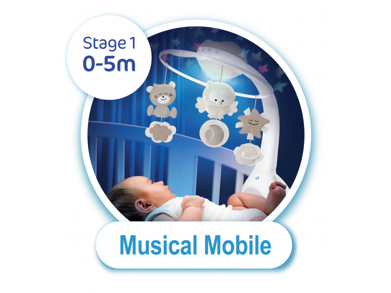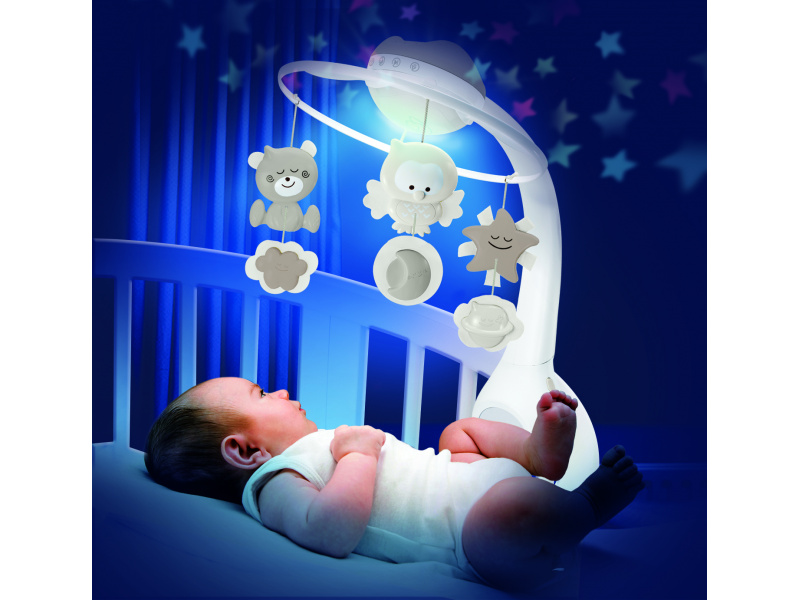 Hudební kolotoč pro snadné usínání i zabavení dítěte nabízí 3 možnosti použití: hudební kolotoč pro děti od narození do 5 měsíců noční světýlko a projektor do postýlky pro děti od 6 do 18 měsíců noční světýlko a projektor na noční stolek pro děti od 18 měsíců Světelný projektor promítá na stěnu či strop hvězdičky a jemně tak osvítí dětský pokoj. Spolu s uklidňující melodií pomůže vašemu dítěti v klidu usínat. Nabízí na výběr z deseti uklidňujících melodií a zvuků přírody. Baterie 3xAAA baterie nejsou součástí výrobku. Vhodné pro děti od narození.