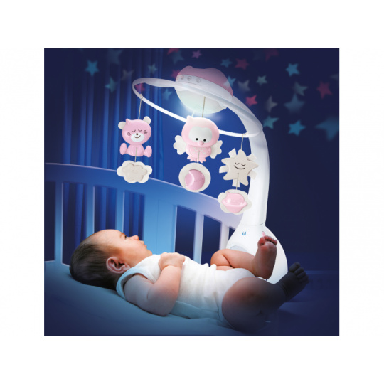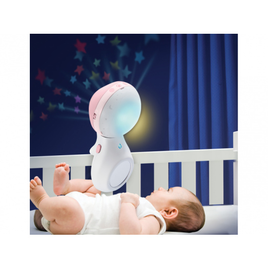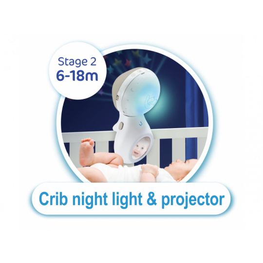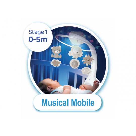 Hudební kolotoč pro snadné usínání i zabavení dítěte nabízí 3 možnosti použití: hudební kolotoč pro děti od narození do 5 měsíců noční světýlko a projektor do postýlky pro děti od 6 do 18 měsíců noční světýlko a projektor na noční stolek pro děti od 18 měsíců Světelný projektor promítá na stěnu či strop hvězdičky a jemně tak osvítí dětský pokoj. Spolu s uklidňující melodií pomůže vašemu dítěti v klidu usínat. Nabízí na výběr z deseti uklidňujících melodií a zvuků přírody. Baterie 3xAAA baterie nejsou součástí výrobku. Vhodné pro děti od narození.