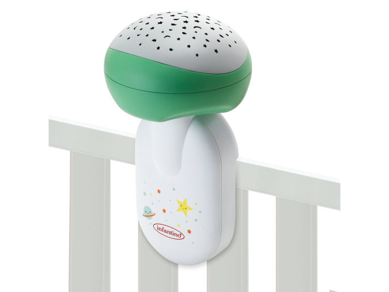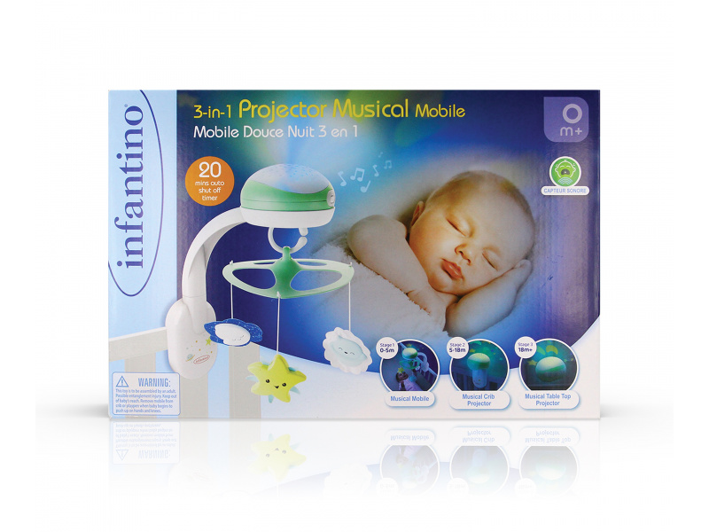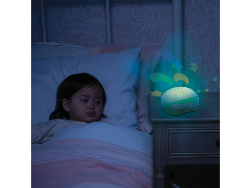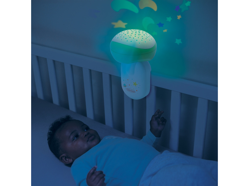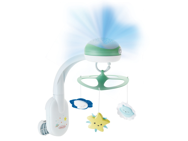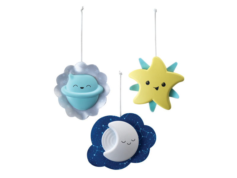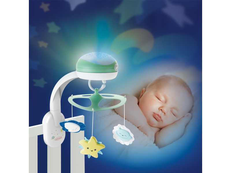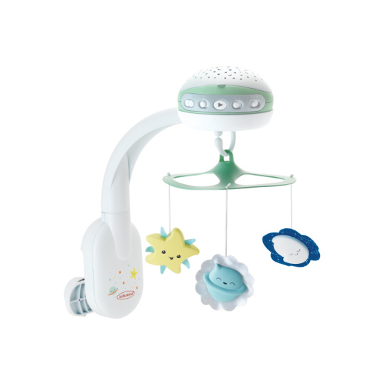 Hudební kolotoč pro snadné usínání i zabavení dítěte nabízí 3 možnosti použití: hudební kolotoč pro děti od narození do 5 měsíců noční světýlko a projektor do postýlky pro děti od 5 do 18 měsíců noční světýlko a projektor na noční stolek pro děti od 18 měsíců Světelný projektor promítá na stěnu či strop hvězdičky a jemně tak osvítí dětský pokoj. Spolu s uklidňující melodií pomůže vašemu dítěti v klidu usínat. Nabízí na výběr z osmi uklidňujících melodií a zvuků přírody. Melodie a přírodní zvuky kolotoč po zapnutí přehrává 20 minut, zvukový senzor přehrávání spustí znovu, pokud dítě během dvou hodin po zapnutí začne plakat. Baterie 3xAA baterie nejsou součástí výrobku. Vhodné pro děti od narození.