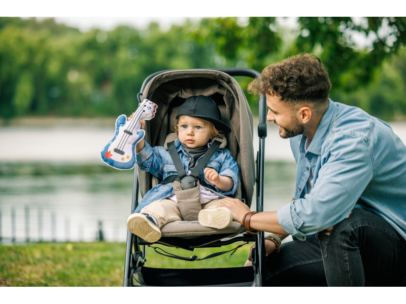 První kytara pro vašeho malého rockera či rockerku je vyrobena z měkkého textilního materiálu a po zmáčknutí přehrává 7 různých rockových melodií a zvuků. Díky plastovému kroužku je možné ji zavěsit na autosedačku či kočárek, aby mohla vaše dítě zabavit i na cestách. Kytara je ideální i pro hraní na bříšku. Hračka obsahuje vyměnitelné knoflíkové baterie 3x LR44/AG13 1,5 V. Rozměry: 29 x 14 x 5,3 cm Vhodné pro děti od narození.