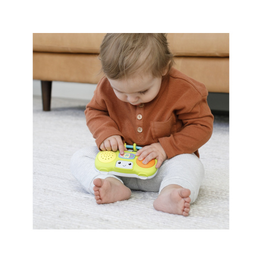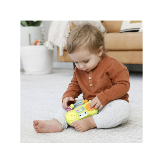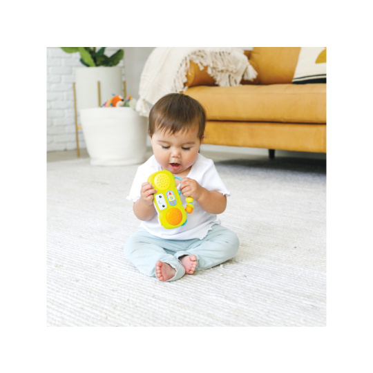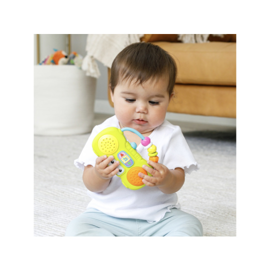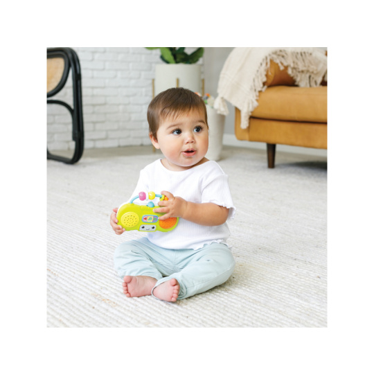Veselé první rádio pro vaše dítě hraje po zmáčknutí tlačítka 5 různých melodií. Pozornost dítěte upoutá blikající světýlko i pohyblivé korálky na rukojeti. Rodiče potěší možnost nastavení hlasitosti. Držadlo usnadňuje přenášení hračky. Hračka rozvíjí jednotlivé smysly a jemnou motoriku dítěte. Baterie 3xLR44 1,5V jsou součástí balení. Rozměry: 14 x 9,3 cm Vhodné pro děti od 6 měsíců.