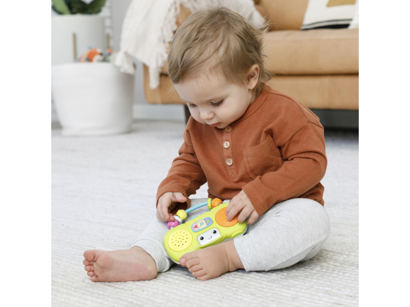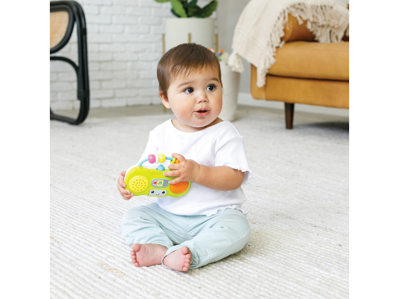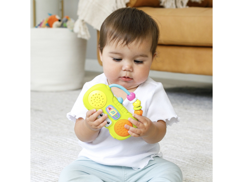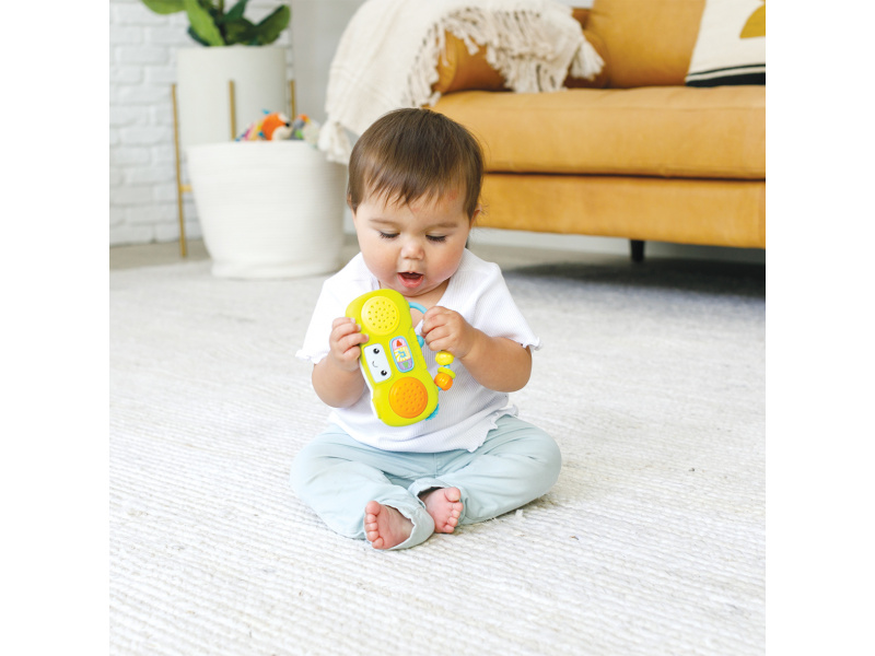 Veselé první rádio pro vaše dítě hraje po zmáčknutí tlačítka 5 různých melodií. Pozornost dítěte upoutá blikající světýlko i pohyblivé korálky na rukojeti. Rodiče potěší možnost nastavení hlasitosti. Držadlo usnadňuje přenášení hračky. Hračka rozvíjí jednotlivé smysly a jemnou motoriku dítěte. Baterie 3xLR44 1,5V jsou součástí balení. Rozměry: 14 x 9,3 cm Vhodné pro děti od 6 měsíců.