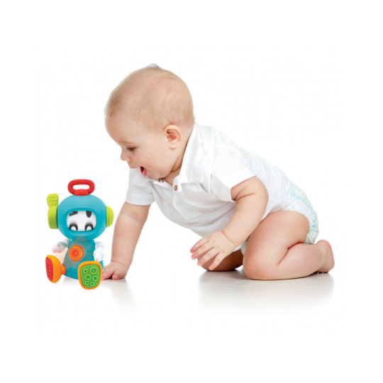 Roztomilý robot pro nejmenší nabízí čtyři různé výrazy obličeje, dvě veselé melodie a 16 světelných a zvukových efektů. Všechny funkce se velmi snadno ovládají zmáčknutím či pohybováním jednotlivými částmi robota. Hračka vaše dítě na dlouhou dobu zabaví a zároveň rozvíjí jeho jednotlivé smysly a motorické dovednosti. Vyměnitelné baterie 2xAAA jsou součástí výrobku. Vhodné od 6 měsíců.