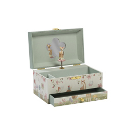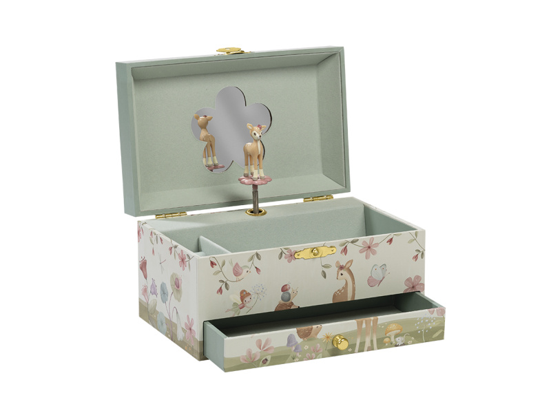 Krásná šperkovnice se zrcátkem a hudebním boxem, který po natažení hraje něžnou melodii. Vaše malá parádnice si do šperkovnice s potiskem motivů ze života v lese může ukládat své šperky a jiné vzácné drobnosti. Šperkovnice je součástí designové kolekce hraček a doplňků Little Dutch Forest Friends inspirované životem v lese. Rozměry: 10 x 10,4 x 18 cm Vhodné pro děti od 3 let.