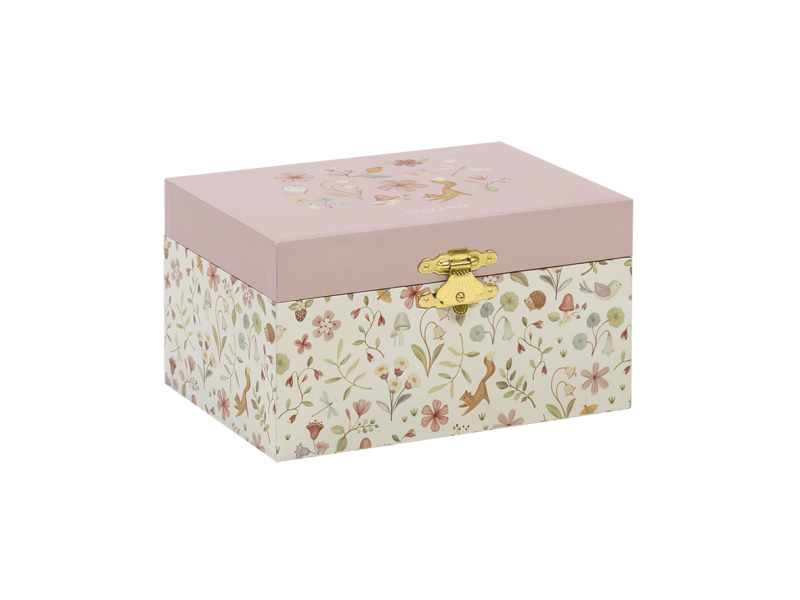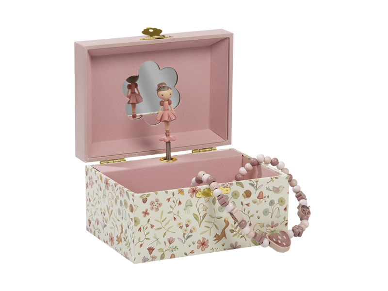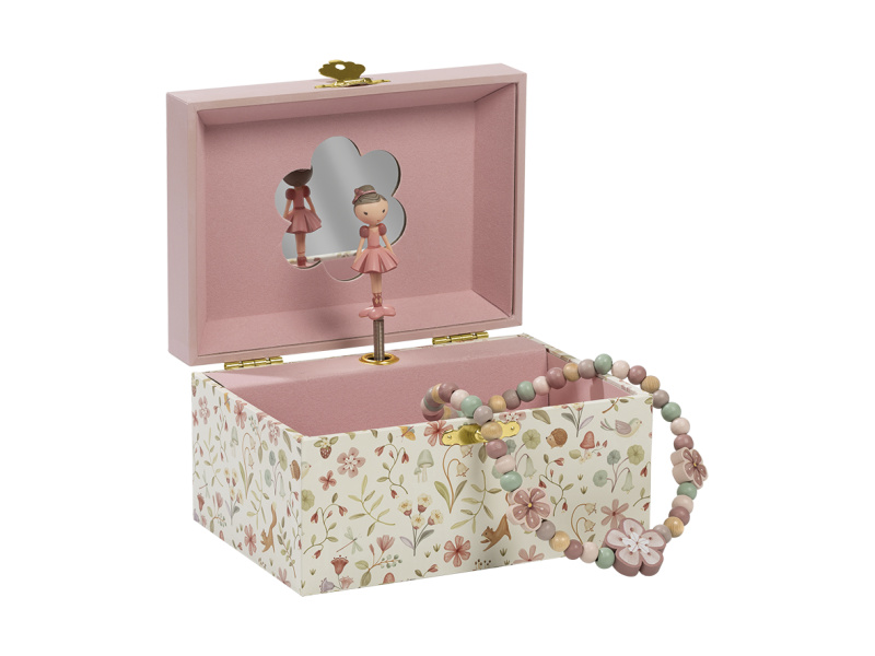 Krásná šperkovnice se zrcátkem a hudebním boxem, který po natažení hraje něžnou melodii. Vaše malá parádnice si do šperkovnice s potiskem květin může ukládat své šperky a jiné vzácné drobnosti. Šperkovnice je součástí designové kolekce hraček a doplňků Little Dutch Fairy Garden inspirované životem na zahradě. Rozměry: 8,5 x 11,5 x 15 cm Vhodné pro děti od 3 let.