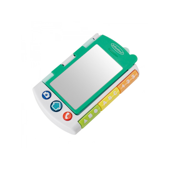 Zábavná interaktivní hračka Infantino, která spojuje telefon na hraní a malou obrázkovou knížku plnou překvapení. Na přední straně má velké zrcátko a tlačítka, se kterými si dítě může hrát na volání nebo focení. Po otevření stránek se spustí vzdělávací obsah – hračka přečte jednoduché věty a vybízí děti k objevování tvarů, barev a čísel. Hudební část nabízí 4 originální písničky, 43 povzbuzujících frází a 6 zábavných zvukových efektů. Všechny mluvené části jsou v angličtině. Vyměnitelné baterie 2xAAA 1,5V součástí výrobku. Vhodné pro děti od 6 do 36 měsíců.