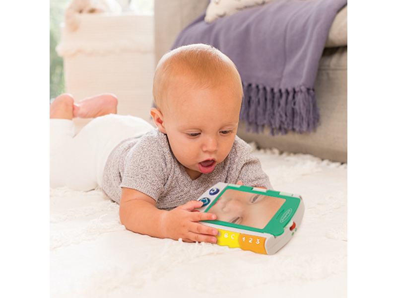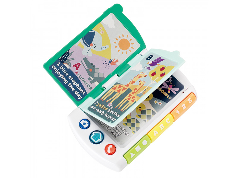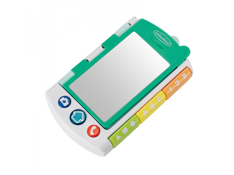 Zábavná interaktivní hračka Infantino, která spojuje telefon na hraní a malou obrázkovou knížku plnou překvapení. Na přední straně má velké zrcátko a tlačítka, se kterými si dítě může hrát na volání nebo focení. Po otevření stránek se spustí vzdělávací obsah – hračka přečte jednoduché věty a vybízí děti k objevování tvarů, barev a čísel. Hudební část nabízí 4 originální písničky, 43 povzbuzujících frází a 6 zábavných zvukových efektů. Všechny mluvené části jsou v angličtině. Vyměnitelné baterie 2xAAA 1,5V součástí výrobku. Vhodné pro děti od 6 do 36 měsíců.