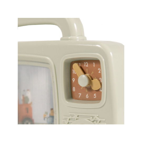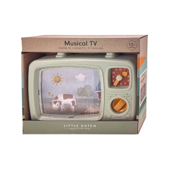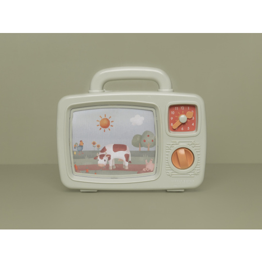 První televize pro vaše dítě po otočení knoflíku hraje příjemnou melodii a obrázky motivů ze života na farmě na displeji se začnou pohybovat. Držadlo usnadňuje přenášení. Hodiny mají pohyblivé ručičky. Hračka rozvíjí představivost, smysly a jemnou motoriku dítěte. Hračka je součástí designové kolekce hraček Little Dutch Farma. Natahovací hračka funguje bez baterií. Vhodné pro děti od 12 měsíců.