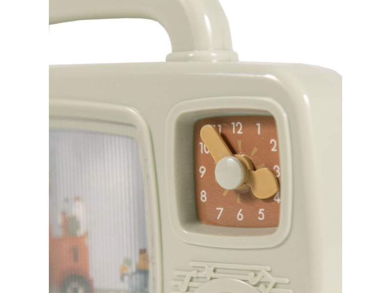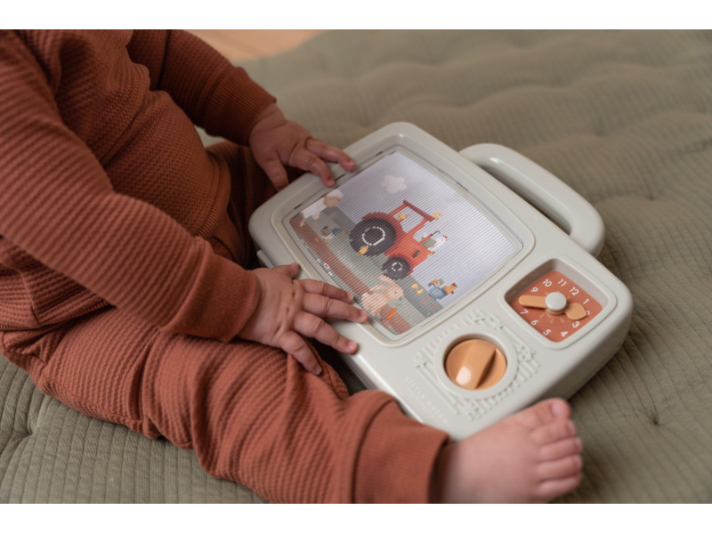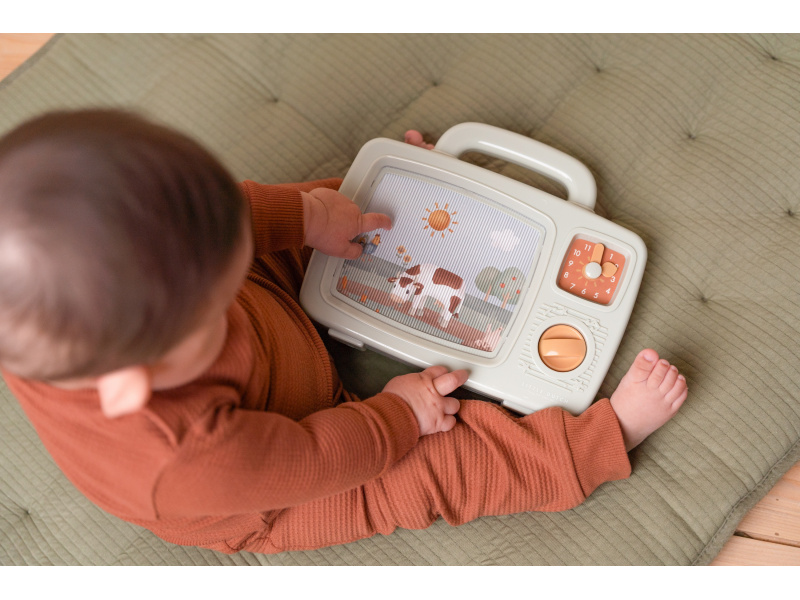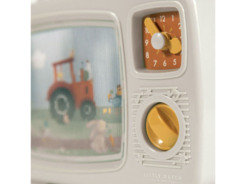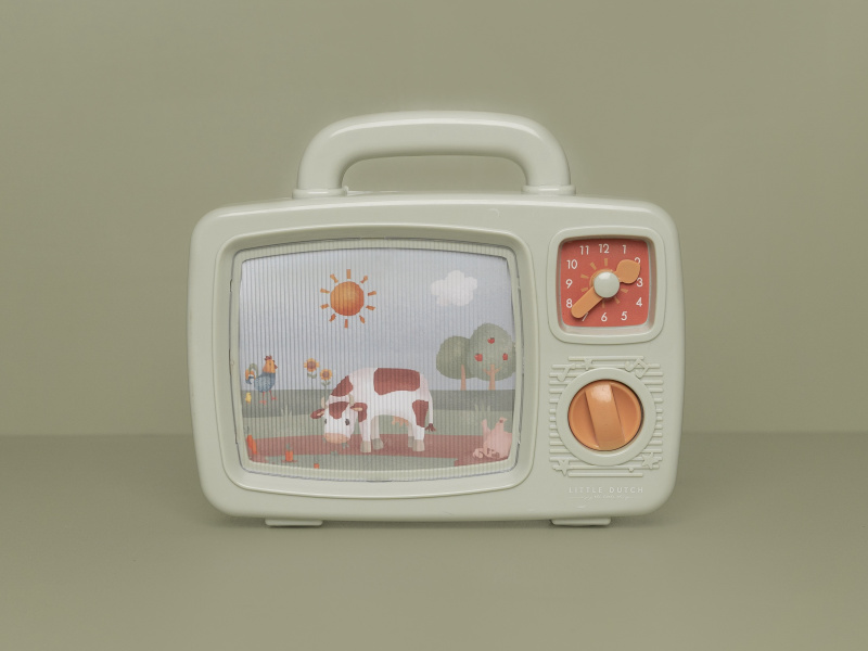 První televize pro vaše dítě po otočení knoflíku hraje příjemnou melodii a obrázky motivů ze života na farmě na displeji se začnou pohybovat. Držadlo usnadňuje přenášení. Hodiny mají pohyblivé ručičky. Hračka rozvíjí představivost, smysly a jemnou motoriku dítěte. Hračka je součástí designové kolekce hraček Little Dutch Farma. Natahovací hračka funguje bez baterií. Vhodné pro děti od 12 měsíců.