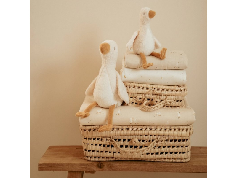 Jemná plyšová hračka v podobě roztomilé husy je ideální jako mazlík do postýlky pro lepší usínání vašeho dítěte. Husa umí sedět a může se tak stát i krásnou dekorací v dětském pokojit. Hračka je součástí designové kolekce hraček a doplňků Little Dutch Newborn Naturals. Výška: 25 cm Složení: 100% polyester Výplň je vyrobena ze 100% recyklovaného polyesteru s certifikací GRS (Global Recycled Standard). Možno prát v pračce na jemný program při 30°C. Vhodné pro děti od narození.
