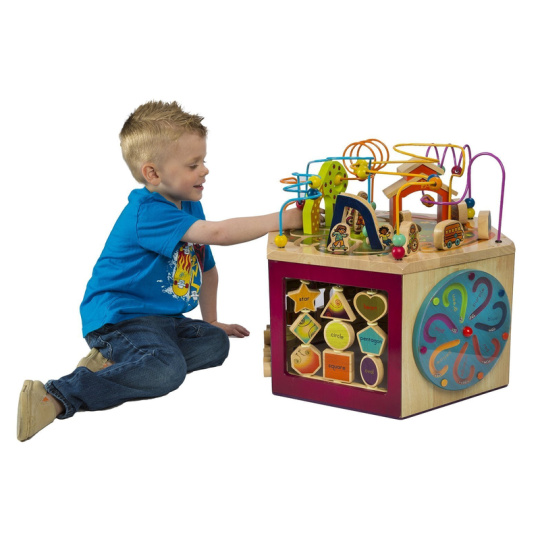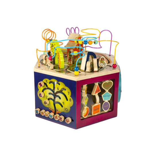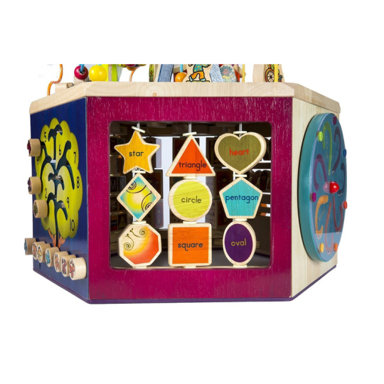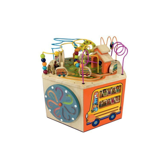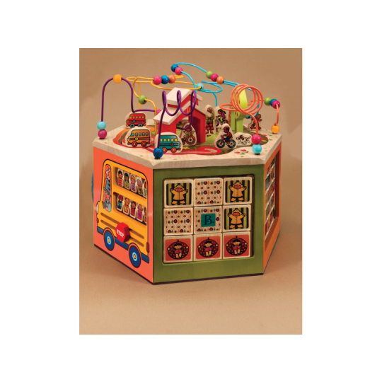 Unikátní dřevěné hrací centrum s množstvím pohyblivých různorodých aktivit zajistí vašemu dítěti hodiny zábavy. Díky své velikosti zabaví současně i několik dětí. Každá ze sedmi stran hracího centra nabízí jiný typ aktivity. Pomůže dětem naučit se barvy, tvary, čísla, písmenka i první anglická slovíčka. Vyrobeno z vysoce kvalitního dřeva s krásnou povrchovou úpravou. Rozměry: 61×61×53,3 cm. Vhodné pro děti od 1 do 3 let.