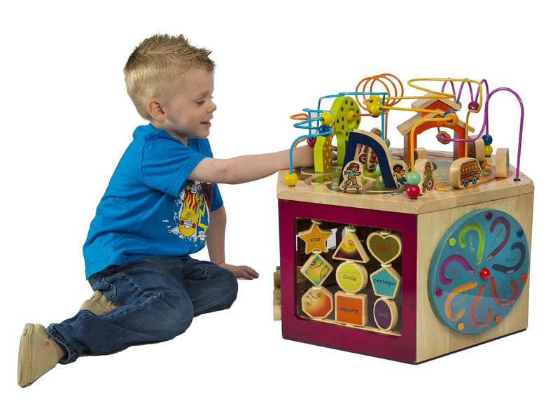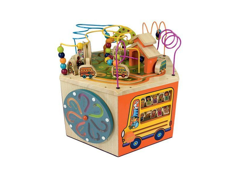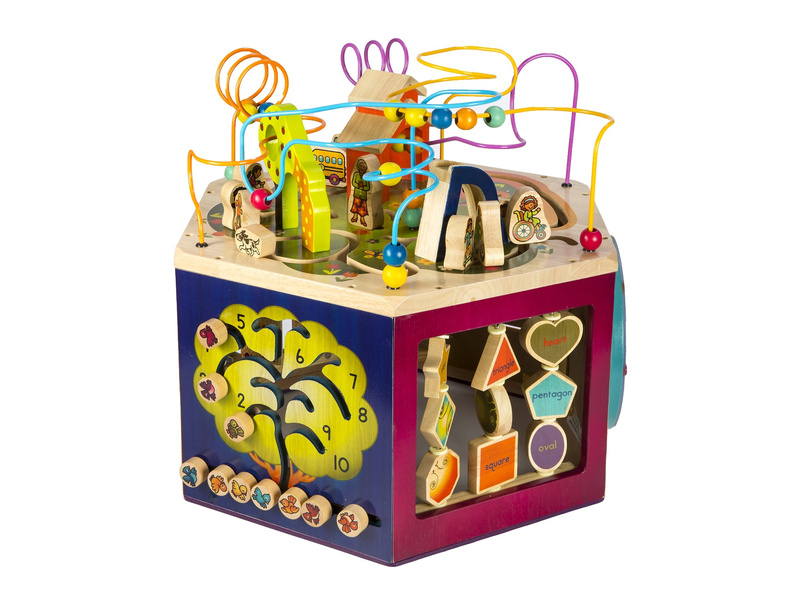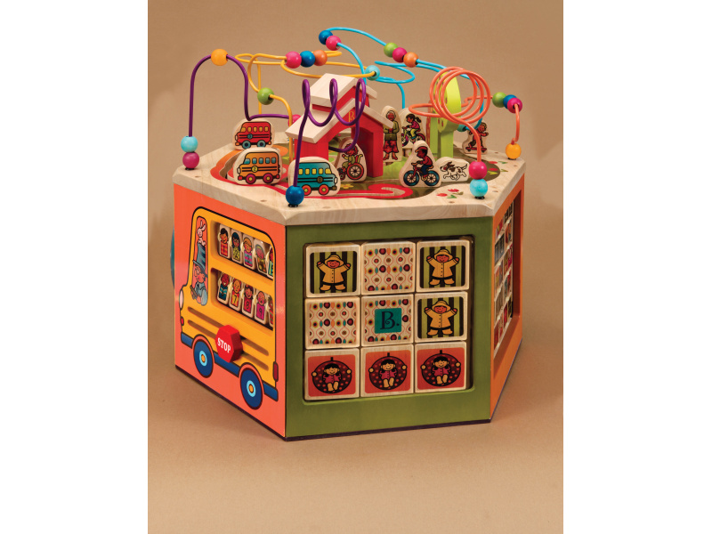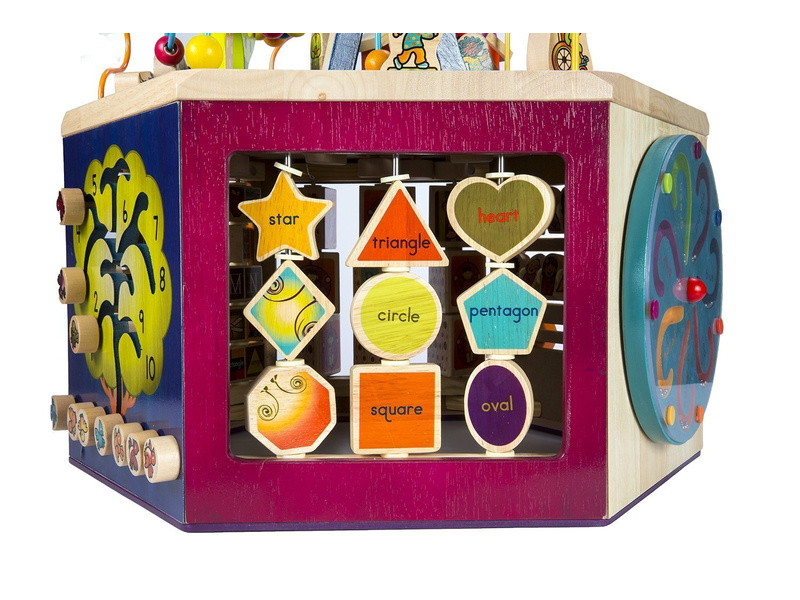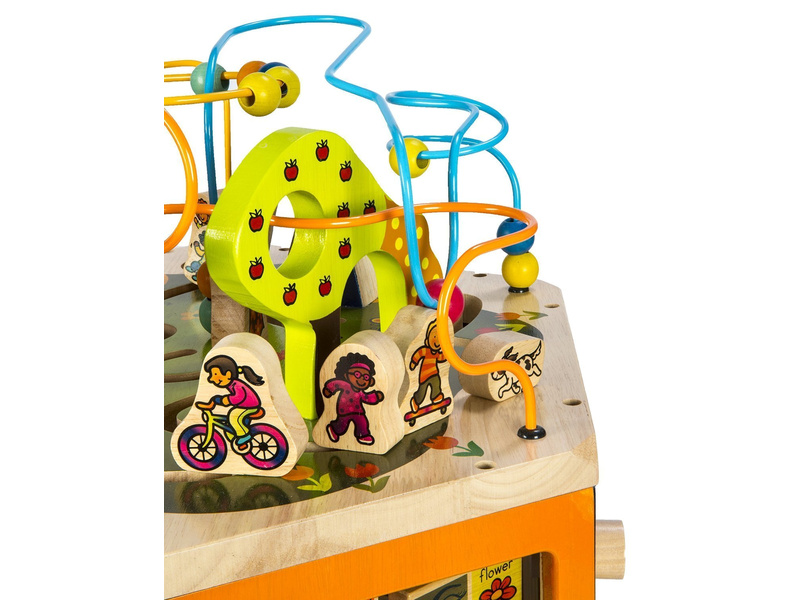 Unikátní dřevěné hrací centrum s množstvím pohyblivých různorodých aktivit zajistí vašemu dítěti hodiny zábavy. Díky své velikosti zabaví současně i několik dětí. Každá ze sedmi stran hracího centra nabízí jiný typ aktivity. Pomůže dětem naučit se barvy, tvary, čísla, písmenka i první anglická slovíčka. Vyrobeno z vysoce kvalitního dřeva s krásnou povrchovou úpravou. Rozměry: 61×61×53,3 cm. Vhodné pro děti od 1 do 3 let.
