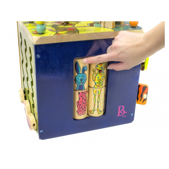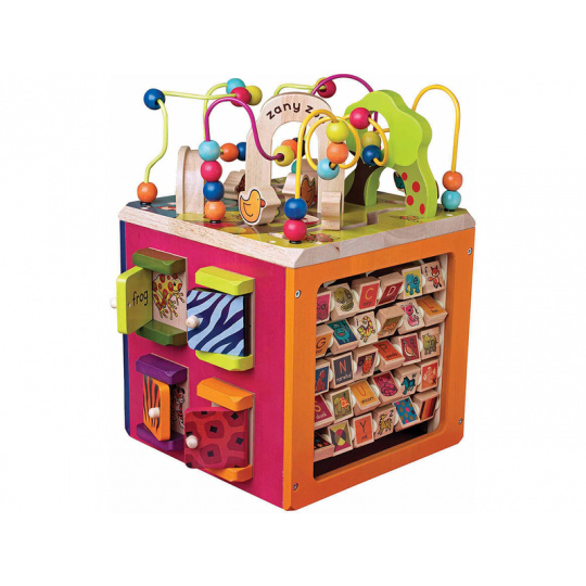Dřevěná krychle s motivy zvířátek ze zoo a množstvím pohyblivých různorodých aktivit zajistí vašemu dítěti hodiny zábavy. Každá strana krychle nabízí jiný typ aktivity. Vyrobeno z vysoce kvalitního dřeva s krásnou povrchovou úpravou. Rozměry: 34,3 × 30,5 × 45,1 cm. Vhodné pro děti od 1 do 3 let.