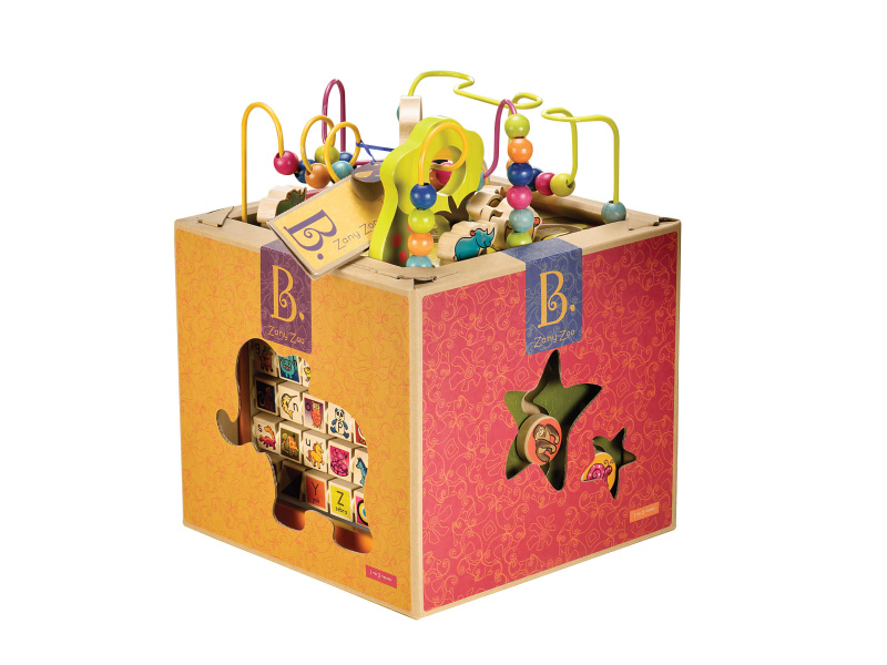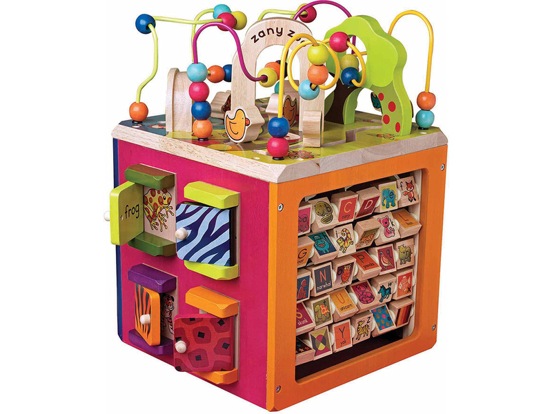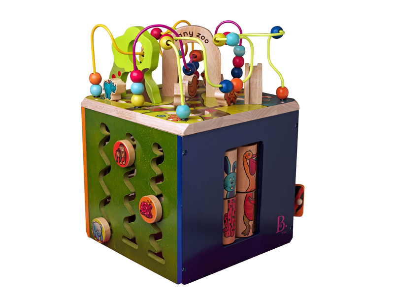 Dřevěná krychle s motivy zvířátek ze zoo a množstvím pohyblivých různorodých aktivit zajistí vašemu dítěti hodiny zábavy. Každá strana krychle nabízí jiný typ aktivity. Vyrobeno z vysoce kvalitního dřeva s krásnou povrchovou úpravou. Rozměry: 34,3 × 30,5 × 45,1 cm. Vhodné pro děti od 1 do 3 let.