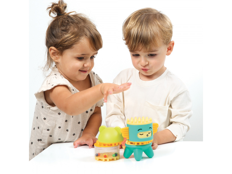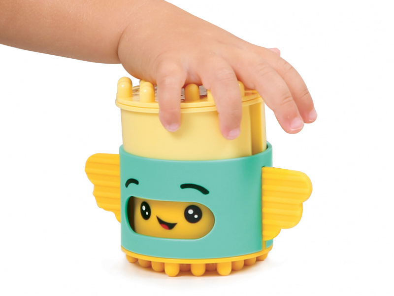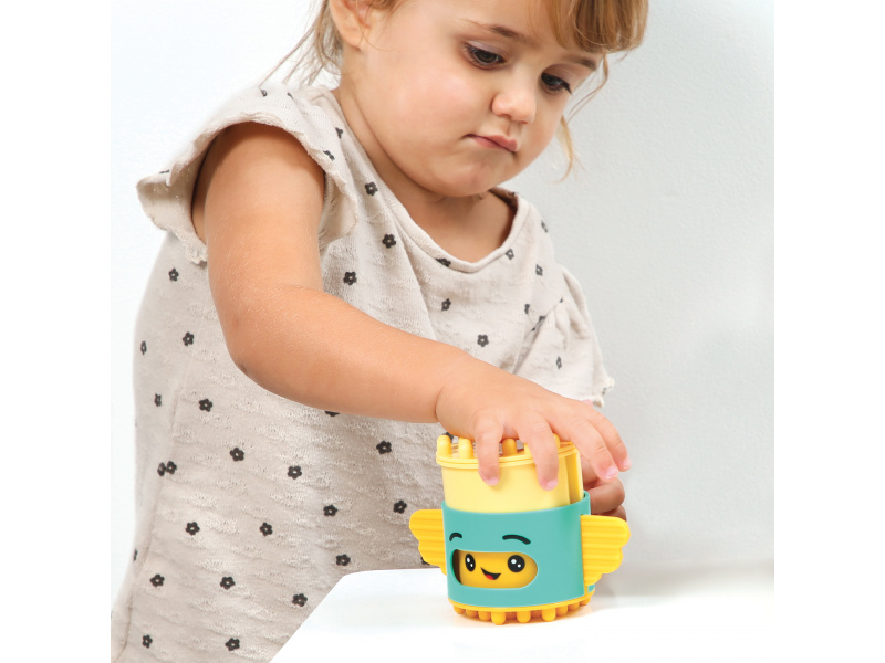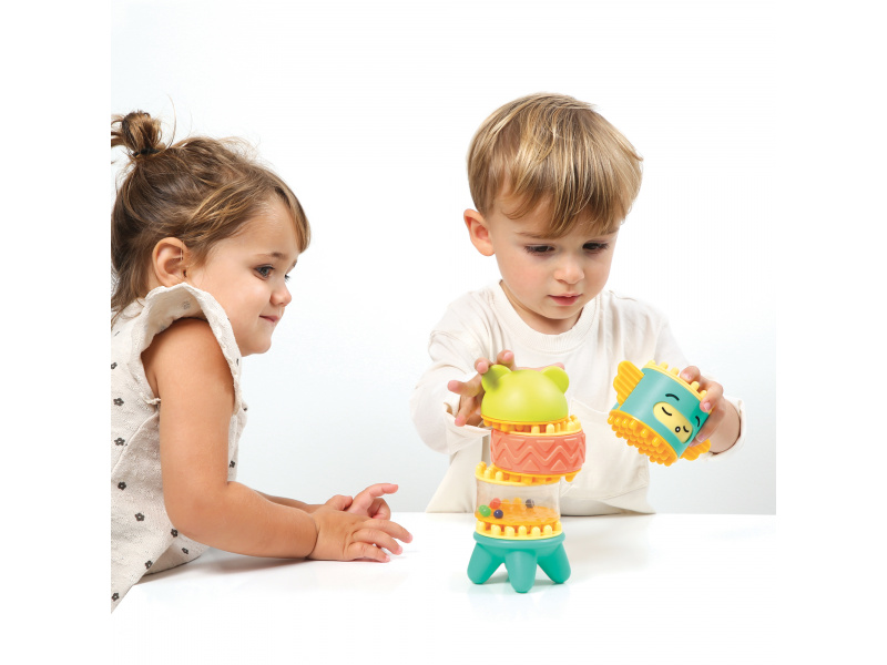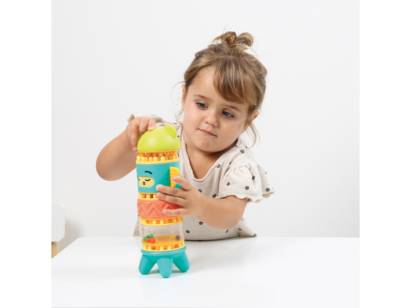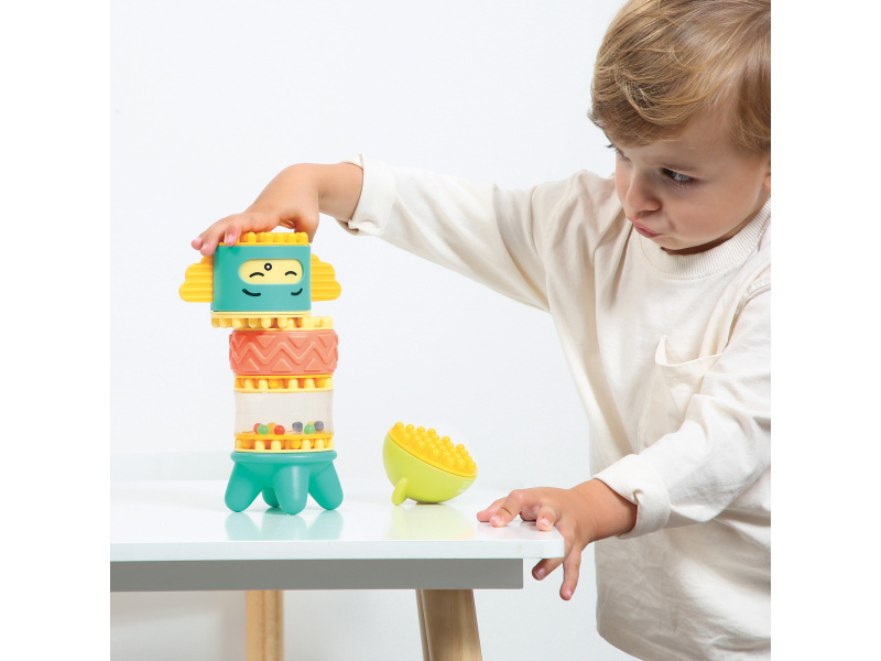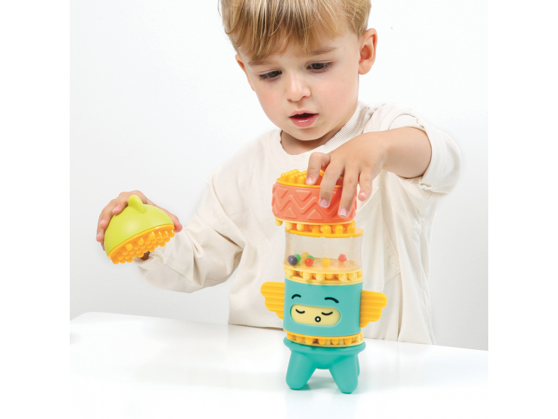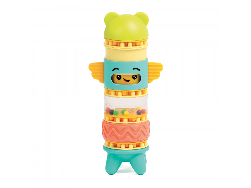 Stavebnice pro nejmenší se skládá se 6 dílů, které dítě skládá na sebe, až vytvoří figurku podobnou totemu. Spící obličejík na jednom z dílů se po zmáčknutí hlavy "probudí" a změní se na obličejík usměvavý. Díly je možné na sebe skládat pokaždé v jiném pořadí a vytvářet tak různé varianty věže. Stavebnice vede děti intuitivně k jednoduchým pohybům, které jsou klíčové pro rozvoj jemné motoriky: skládání, válení, spojování atd. Děti si procvičují úchop, prostorové vnímání, soustředění, a trpělivost při skládání dílků. Stavebnice je vyrobena z materiálu příjemného na dotek. Rozměry: 24 x 12 x 8 cm, Vhodné pro děti od 10 měsíců.