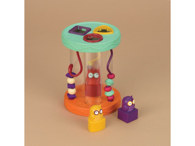 Multifunkční hračka s houkajícími sovičkami. Tři sovičky se základnou různých tvarů po vložení správného otvoru kloužou dolů a houkají. Hračku je možné položit na zem a kutálet jako válec. Rozměry: výška 21 cm, průměr válce 15 cm. Vhodné pro děti od 6 měsíců do 3 let.