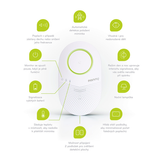 Nanny je chytrý monitor dechu, který vás přivolá na pomoc, jakmile se mu něco nebude zdát zcela v pořádku. Navíc vás upozorní u případné zástavy dechu v důsledku dávení. Při každém nádechu dítěte blikne zelená kontrolka. Pokud se miminko nenadechne po dobu 20 sekund, nebo se frekvence jeho dýchání sníží pod 8 nádechů za minutu, začne svítit červené světlo a spustí se poplach. Už jen zvuk alarmu často stačí k tomu, aby se miminko probudilo z hlubokého spánku a nadechlo se.