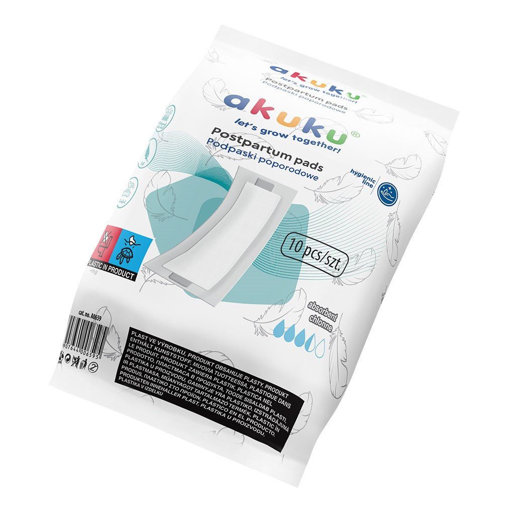 Superabsorpční poporodní vložky „akuku” jsou určeny pro ženy v období šestinedělí, aby se cítily pohodlně a svobodně v každé situaci. Jemná a super měkká vnitřní vrstva zabraňuje přilepování vložky a podráždění pokožky. Vrchní vrstva umožňuje cirkulaci vzduchu, čímž zajišťuje pocit svěžesti, a superabsorpční materiál uvnitř vložky rychle váže vlhkost a neutralizuje nepříjemné pachy. Široký lepící pásek udržuje vložku na místě.