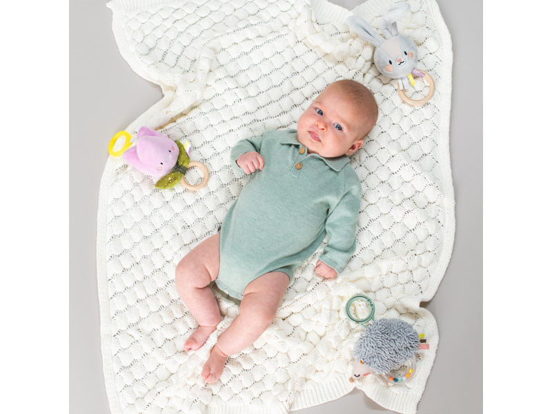 Chrastítko tvoří měkká plyšová hračka v podobě střapatého ježka Spikeho a průhledný plastový kroužek naplněný barevnými korálky. Různé tvary a povrchy hračky podněcují dítě ke zkoumání rukama i ústy a pomáhají rozvíjet jemnou motoriku a smysly dítěte. Vhodné pro děti od narození.