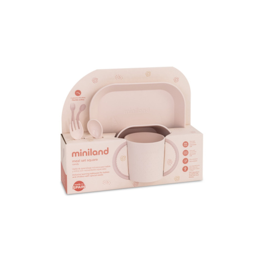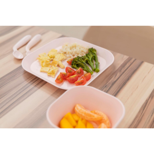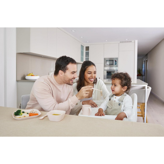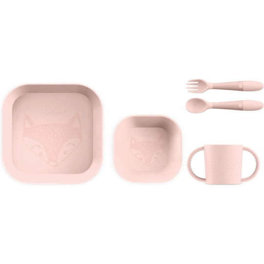 Jídelní sadu tvoří talíř, miska, hrnek se 2 uchy, pružná lžička a vidlička. Talíř i miska s vysokými okraji pomáhají snadnému nabírání pokrmu. Lžička a vidlička jsou vyrobeny z flexibilního příjemného materiálu a mají neklouzavá, kulatá držadla, která usnadňují dítěti držení. Hrnek se dvěma uchy pomáhá dítěti naučit se pít z klasického hrnku. Všechny části jídelní sady je možné mýt v myčce a používat pro ohřátí pokrmu či nápoje v mikrovlnné troubě. Složení: PP Vhodné pro děti od 6 měsíců.