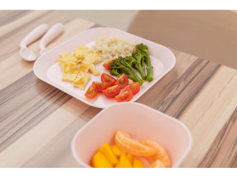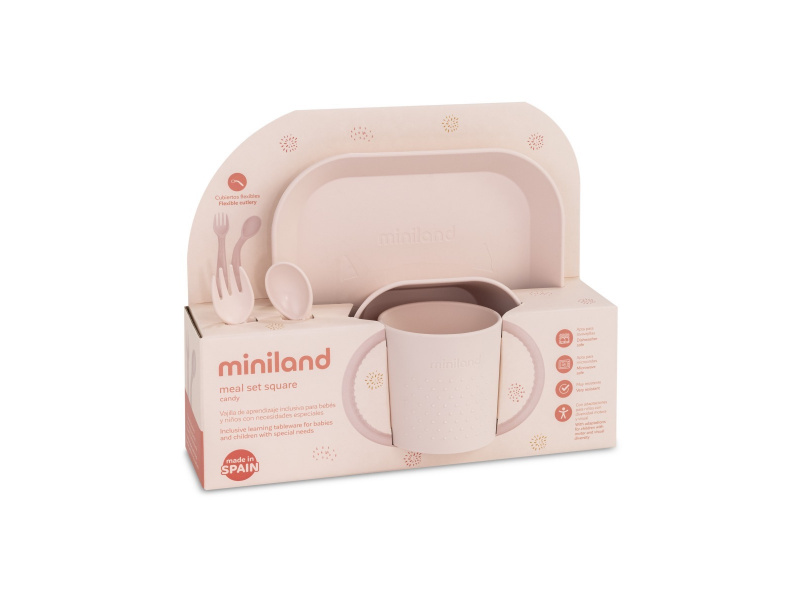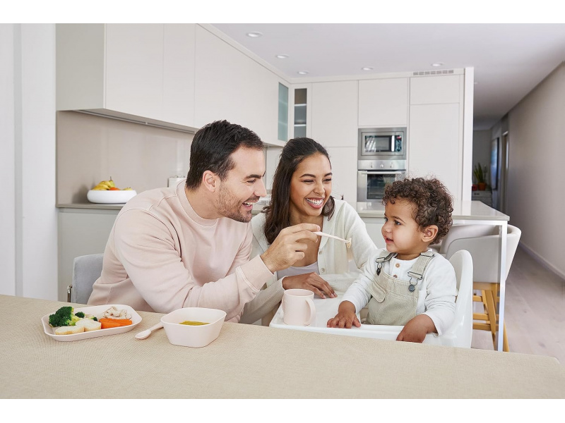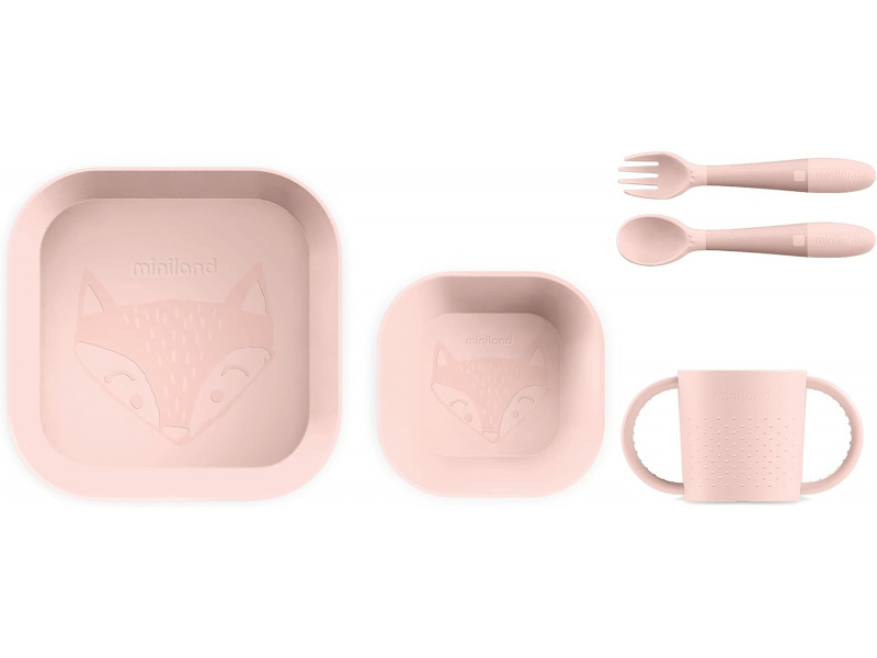 Jídelní sadu tvoří talíř, miska, hrnek se 2 uchy, pružná lžička a vidlička. Talíř i miska s vysokými okraji pomáhají snadnému nabírání pokrmu. Lžička a vidlička jsou vyrobeny z flexibilního příjemného materiálu a mají neklouzavá, kulatá držadla, která usnadňují dítěti držení. Hrnek se dvěma uchy pomáhá dítěti naučit se pít z klasického hrnku. Všechny části jídelní sady je možné mýt v myčce a používat pro ohřátí pokrmu či nápoje v mikrovlnné troubě. Složení: PP Vhodné pro děti od 6 měsíců.