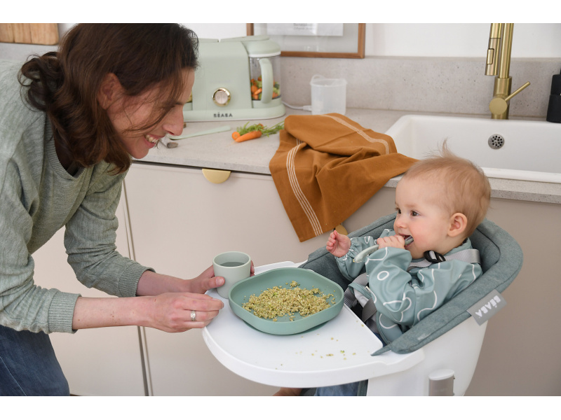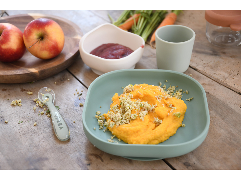 Sada talíře, misky, kelímku na pití a lžičky z vysoce kvalitního silikonu je ideální pro první samostatné krmení. Přísavka u misky a talíře umožňuje uchycení ke stolu nebo pultu jídelní židličky. Ergonomický tvar usnadňuje nabírání příkrmu. Silikonový měkký materiál je bezpečný a příjemný při používání. Je odolný vysokým i nízkým teplotám a není náchylný k vytváření skvrn od barevných potravin. Vhodné do myčky i mikrovlnné trouby. Neobsahuje BPA. Pro děti od 4 měsíců.
