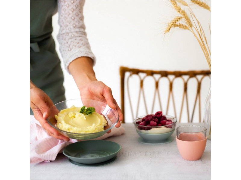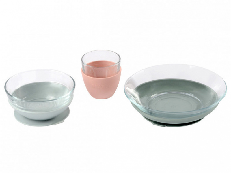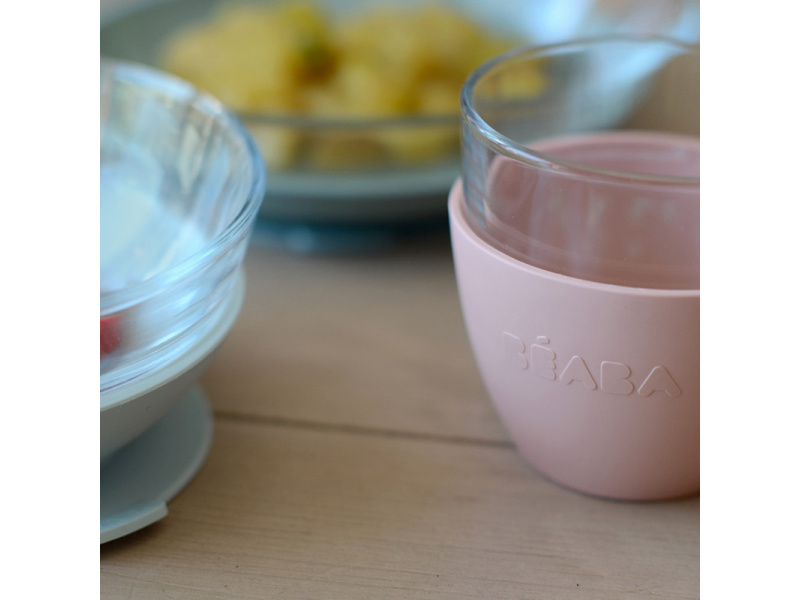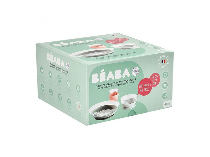 Unikátní sadu nádobí z tvrzeného skla tvoří jídelní miska, talířek a sklenička ergonomického, zaobleného tvaru s hladkými hranami. Miska a talíř jsou doplněny speciálními odnímatelnými podložkami z pružného materiálu s přísavkou, která zajišťuje stabilitu misky či talíře na stole a usnadňuje dítěti stolování. Návlek na skleničku ze stejného materiálu usnadňuje dítěti uchopení skleničky a snižuje riziko jejího vyklouznutí z ruky. Tvrzené sklo je 100% hygienický materiál odolný vůči poškrábání, nárazům a vysokým teplotám. V případě rozbití nedojde k vytvoření ostrých střepů. Sada nádobí je výsledkem spolupráce dvou francouzských značek - Beaba a Duralex. Ikonická značka Duralex je od roku 1945 průkopníkem ve výrobě tvrzeného skla. Nádobí je vyrobeno ve Francii. Nádobí bez odnímatelných podložek lze ohřívat v mikrovlnné troubě i mýt v myčce. Podložky je možné mýt ručně. Rozměry a hmotnost: Talíř: ø 17,5 cm x v 4,3 cm, 337 g Miska: ø 12 cm x v 5,3 cm, 300 ml, 243 g Sklenice: ø 7,1 cm x v 7 cm, 150 ml, 156 g Vhodné pro děti od 4 měsíců.