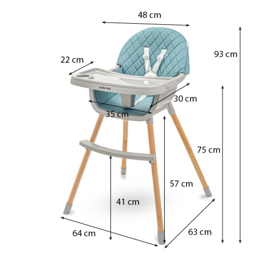 Jídelní židlička Baby Mix má všechny funkce, které usnadňují každodenní krmení: nastavitelný dvojitý tácek, 5bodové pásy, odnímatelné čalounění z eko kůže, opěrka nohou, látkový koš, protiskluzové nožičky. Židli lze snadno přeměnit na nízkou židli odstraněním spodní části nohou.Jídelní židlička Baby Mix je vhodná pro děti ve věku 6-36 měsíců.