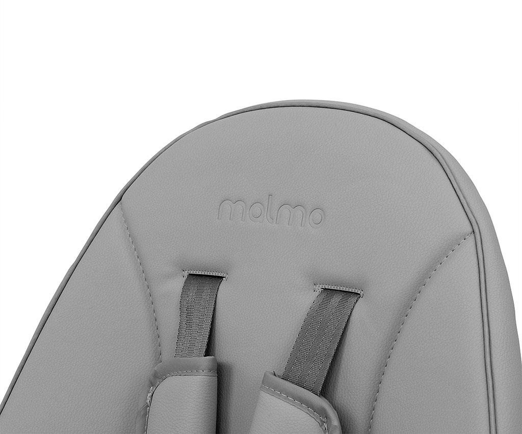 Pětibodové bezpečnostní pásy se širokými a měkkými ramenními vycpávkami chrání dítě před odřeninami. Čalounění židle Malmo z ekokůže je odolné proti znečištění a snadno se čistí. Tác má prohlubeň, která zabraňuje sklouznutí předmětů.