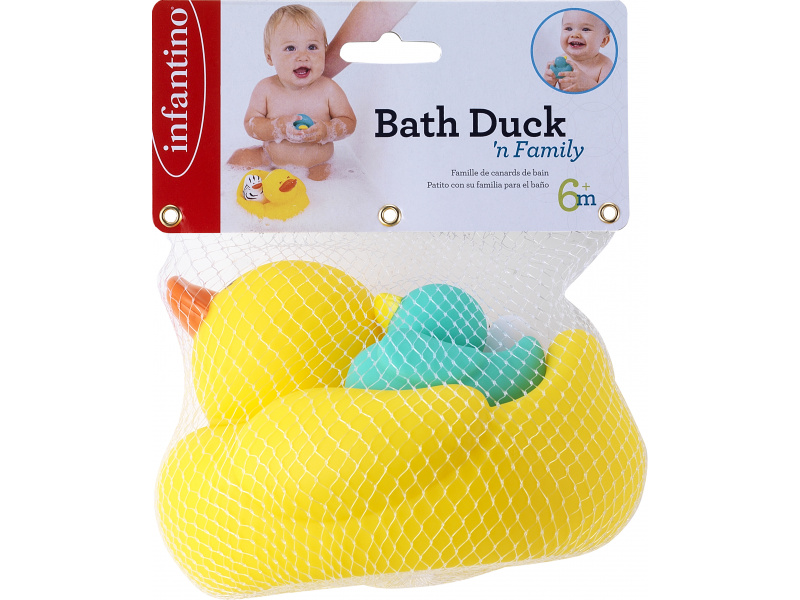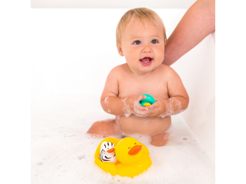 Kachní rodinku tvoří kačenka se dvěma kachňaty. Kačenka dokáže plout na hladině s oběma kachňaty na zádech, ale kachňata se umí pustit do vody i samostatně. Vymýšlejte spolu s dítětem během koupání příběhy, co všechno kachní rodinka na vodě zažívá a užívejte si společně příjemné chvíle před spaním. Vhodné pro děti od 6 měsíců.