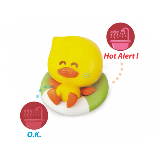 Roztomilá hračka do koupele v podobě kačenky je vybavena tepelným senzorem pro snadnou a rychlou kontrolu teploty vody ve vaně. Po vložení do příliš teplé vody se objeví kontrastní symbol na spodní části hračky, který vás upozorní, že teplota vody není optimální pro vložení dítěte. Vhodné pro děti od narození.