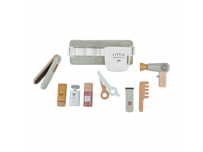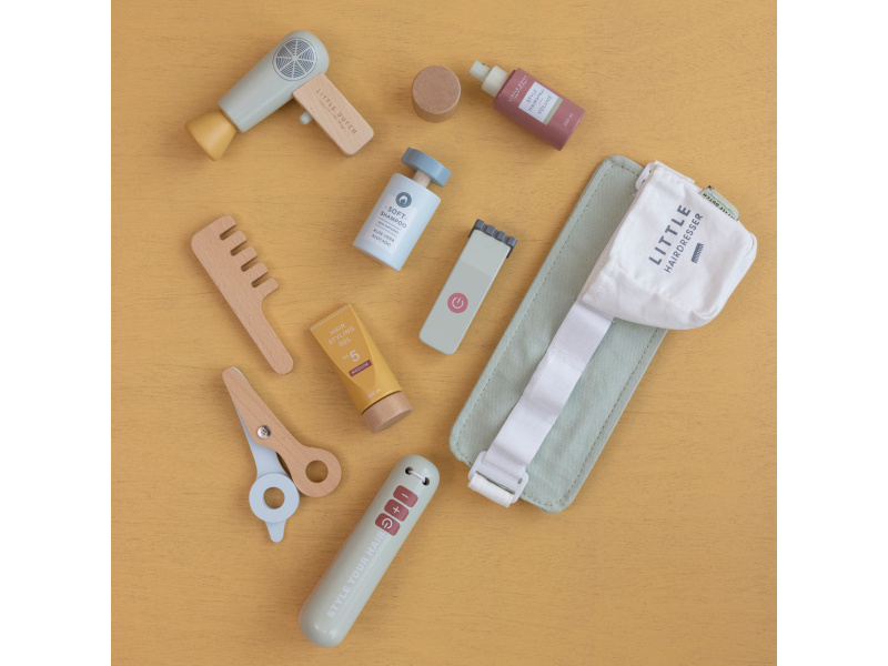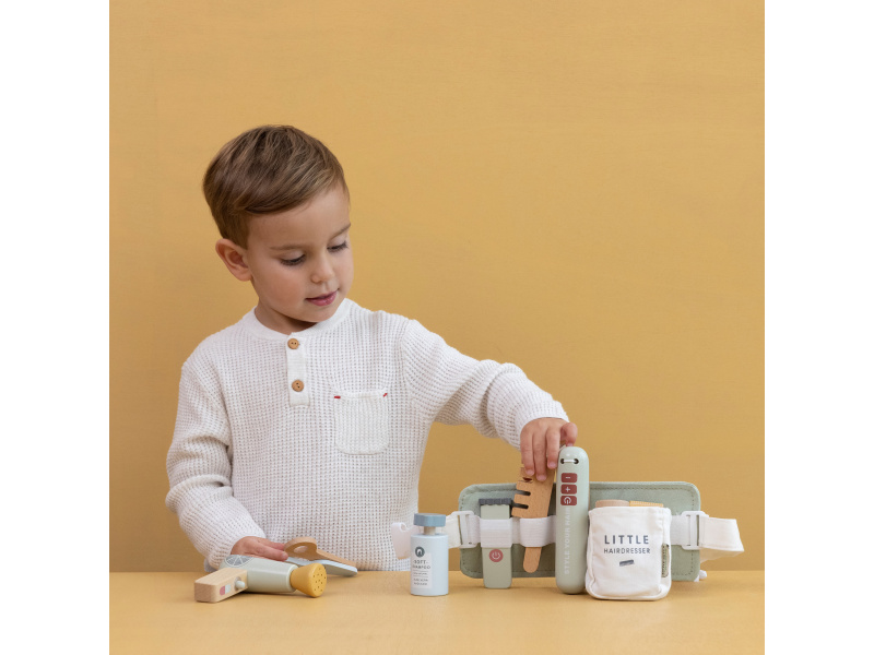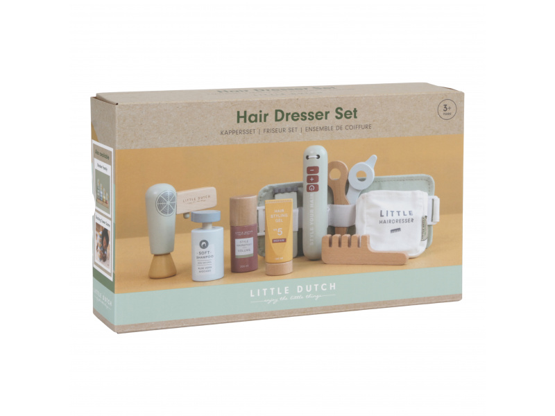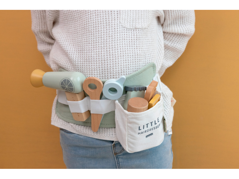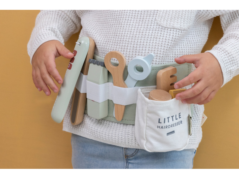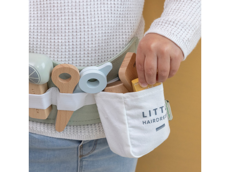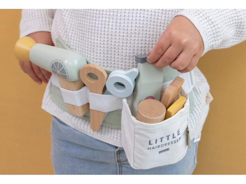 Malá kadeřnice či kadeřník mohou s touto bohatě vybavenou sadou pozvat své kamarády, rodinu či panenky do svého kadeřnictví. Díky nastavitelnému bedernímu pásu budou mít vše vždy při ruce, aby se mohli soustředit na vytváření těch nejúžasnějších účesů. Sada v dřevěném provedením obsahuje nůžky, fén, žehličku na vlasy, zastřihovače, hřeben, šampon, sprej na vlasy a stylingový gel. Vhodné pro děti od 3 let.