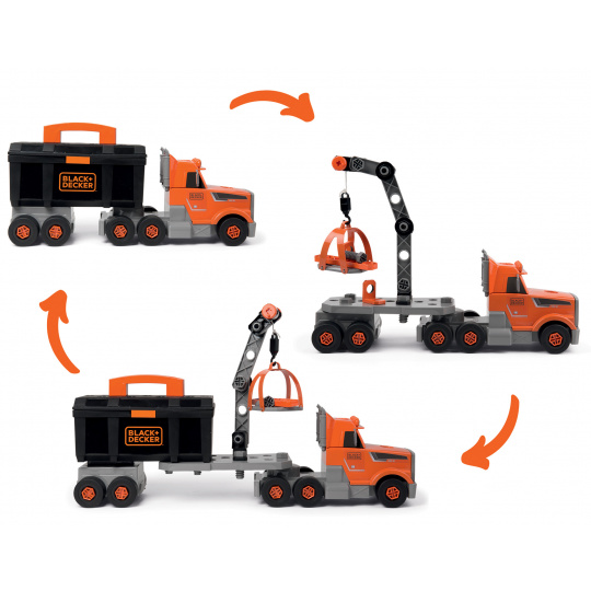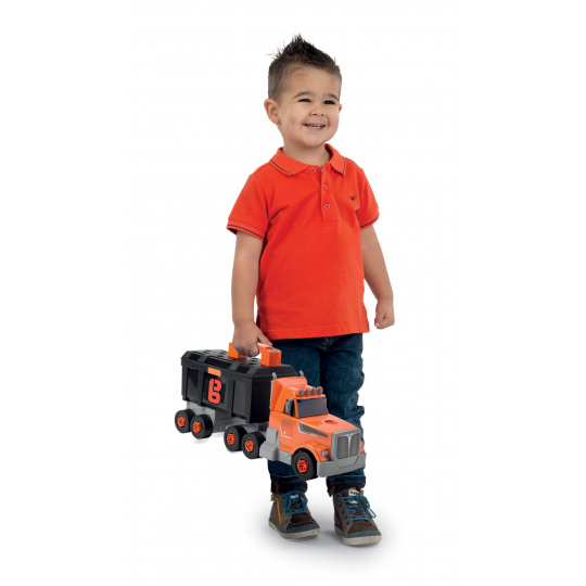 Kamion s pracovním kufříkem od renomovaného francouzského výrobce Smoby je skvělá hračka pro chlapce od 3 let. Originální motiv Black&Decker zaručeně potěší každého malého řemeslníka, který si bude moci sám sestavit na nákladní plošině jeřáb se závěsnou plošinou. Celý dětský tahač se dá skládat a rozkládat a dítě má k dispozici bohatou sadu 60 doplňků, mezi nimiž se nacházejí šrouby, šroubovák, klíč a další pomůcky pro montáž jeřábu. Na nákladní plošině se nachází přenosný kufřík s doplňky, který se dá snadno přenášet díky praktické rukojeti. Kamion v krásném oranžovo-černém provedení zabaví vašeho chlapečka na dlouhé hodiny.