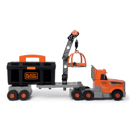 Dětský kamion s nákladní plošinou a jeřábem je vynikající dárek pro chlapce, kteří si rádi hrají na mechaniky a konstruktéry. Na přenosném kufříku se nachází logo Black&Decker, kamion působí realistickým dojmem. Chlapci se při hře na automechaniky nejen výborně zabaví, ale také získávají pocit zodpovědnosti, učí se pracovat s různým nářadím, rozvíjejí si technickou představivost a logické myšlení. Manipulací s nářadím si zlepšují i jemnou motoriku a celkovou pohybovou zručnost. Kamion pro děti je má celkovou délku 43 cm, jeho rozměry jsou 43*14*18 cm. Neobsahuje elektronické funkce.