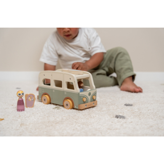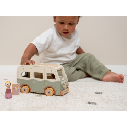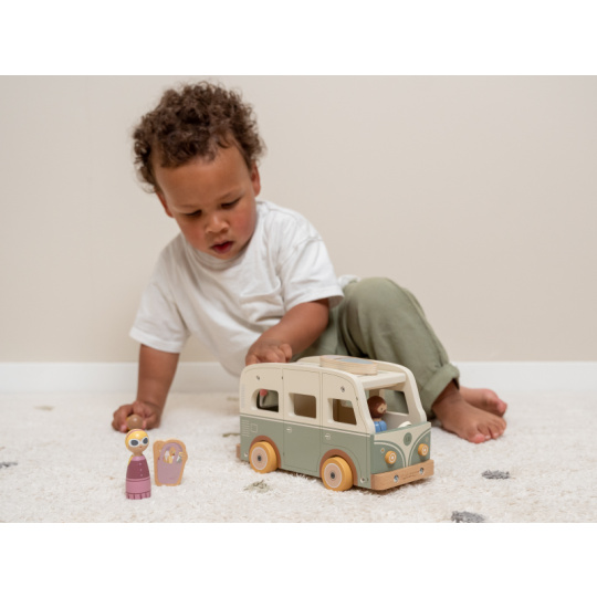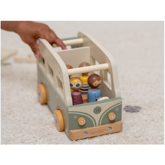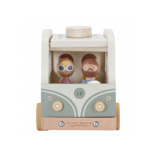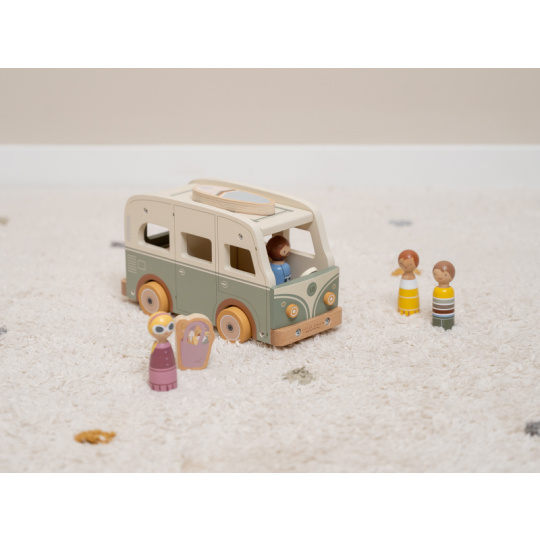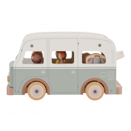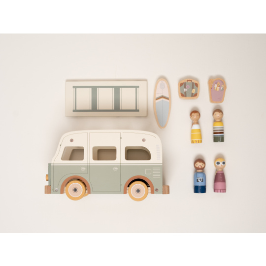Karavan v kvalitním dřevěném provedení má odnímatelnou střechu, aby bylo možné dovnitř posadit celou rodinu, kufr a zásoby jídla na víkend. Surf se připevní na střechu a víkend u moře může začít! Obsah balení: karavan, 4 figurky, kufr, taška s jídlem a surf. Rozměry: 22,5 x 10,5 x 12,5 cm Vhodné pro děti od 18 měsíců.