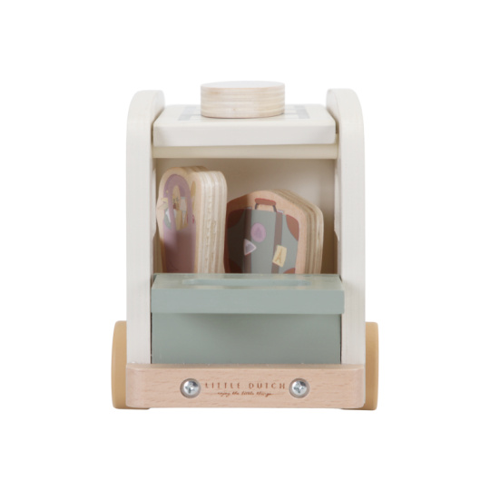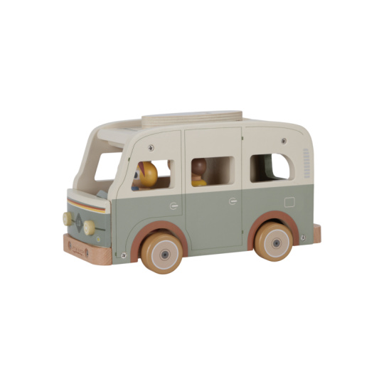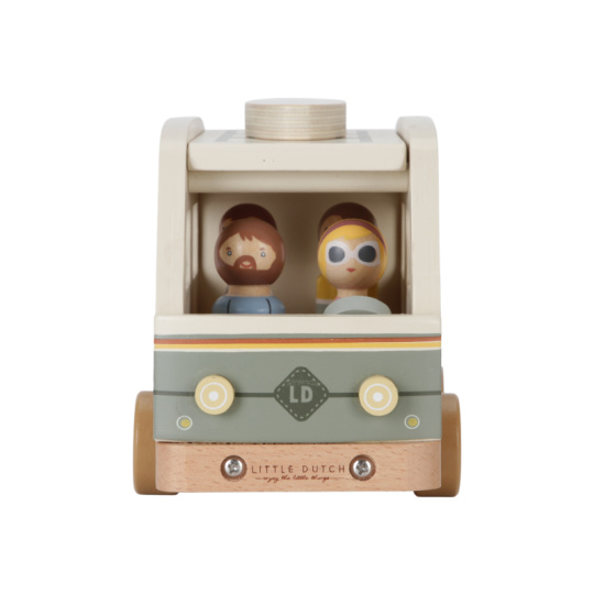 Karavan v kvalitním dřevěném provedení má odnímatelnou střechu, aby bylo možné dovnitř posadit celou rodinu, kufr a zásoby jídla na víkend. Surf se připevní na střechu a víkend u moře může začít! Obsah balení: karavan, 4 figurky, kufr, taška s jídlem a surf. Rozměry: 22,5 x 10,5 x 12,5 cm Vhodné pro děti od 18 měsíců.