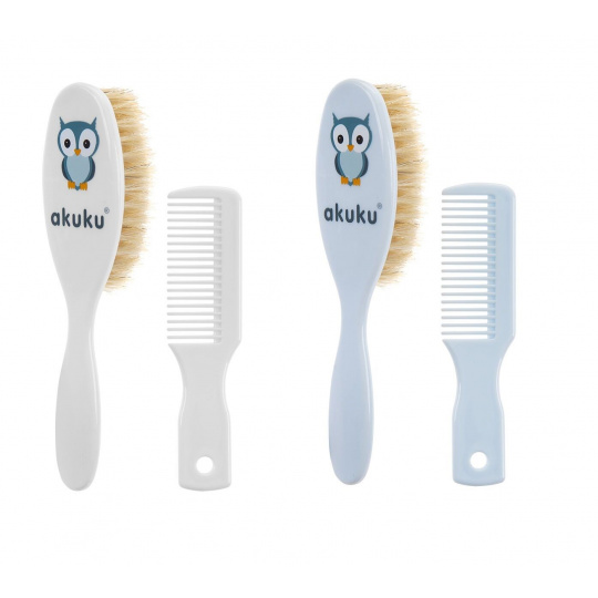 Kartáček a hřebínek s přírodním vlasem Akuku. Vyrobeno bez BPA. Rozměry: hřebínek: cca 11 cm, kartáček: cca 15 cm. Vhodné pro děti od narození.