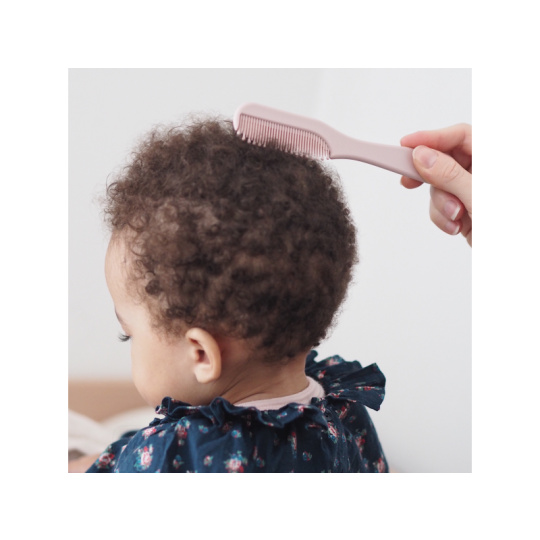 Sada pro péči o vlásky vašeho dítěte od narození obsahuje kartáč s měkkými štětinami a hřebínek se zaoblenými zuby. Ergonomický tvar kartáče i hřebene usnadňuje rodiči uchopení. Hřebínek je uložený v zadní části kartáče, celou sadu můžete díky kroužku snadno zavěsit na háček. Vhodné pro děti od narození