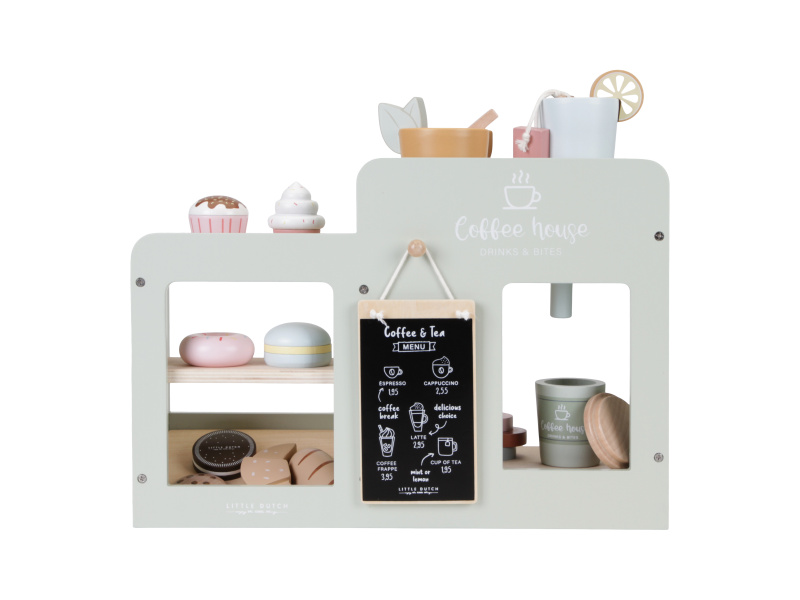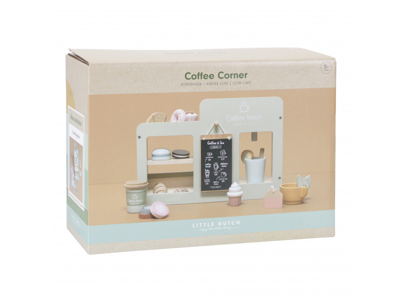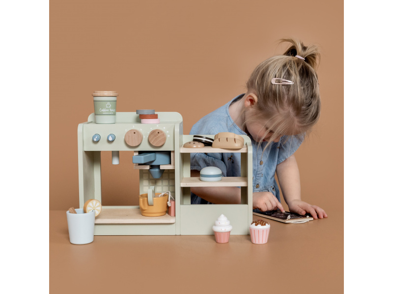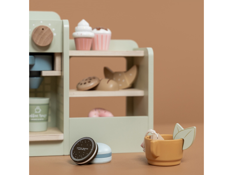 Dáte si kávu nebo čaj? S tímto dřevěným kávovarem s bohatým příslušenstvím si může vaše dítě otevřít doma vlastní kavárnu a pozvat vás na cappuccino či espresso spolu s dortíkem, koláčkem či sendvičem. Pro přípravu kávy stačí otočit knoflíkem, zmáčknout tlačítko a káva je hotová! Poličky s vystavenými zákusky lákají k ochutnání, nápojový lístek vám usnadní objednávání nápojů. Součástí sady jsou hrnečky, talířky, kávové kapsle, čajový sáček, croissant, donut, cupcake, muffin a mnoho dalších doplňků pro servírování občerstvení. Děti se učí napodobováním svých rodičů a zároveň hra rozvíjí kreativitu, soustředění, jemnou motoriku a sociální dovednosti. Sadu můžete doplnit dalšími dřevěnými hračkami Little Dutch, např. Narozeninovým dortem 4494LD, Čajovým setem 7006LD, Pokladnou se skenerem 7082LD apod. Rozměry: 34,4 x 13,7 x 24 cm Vhodné pro děti od 3 let.