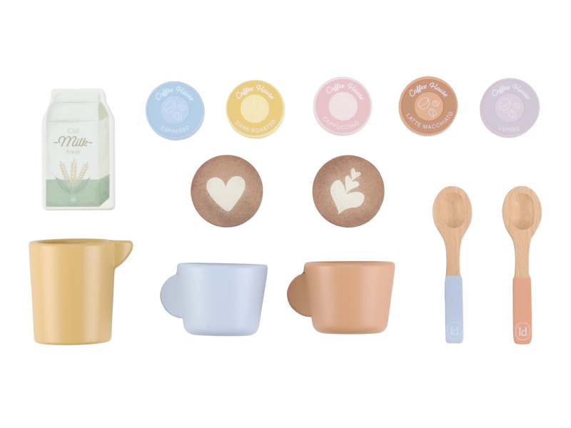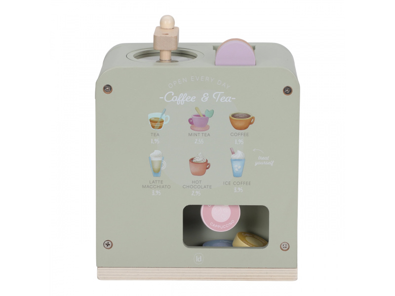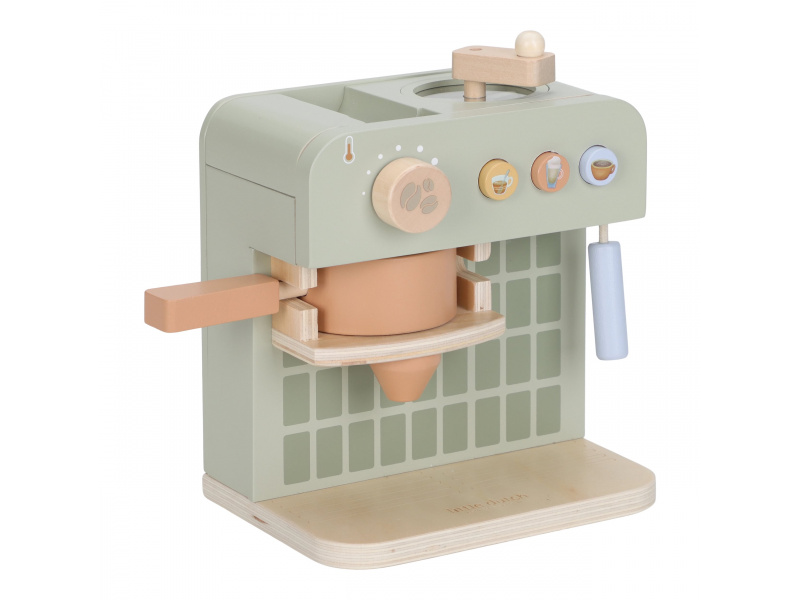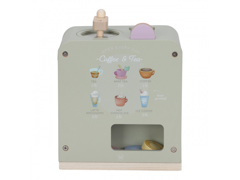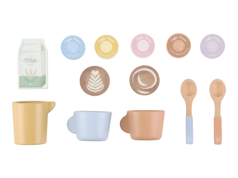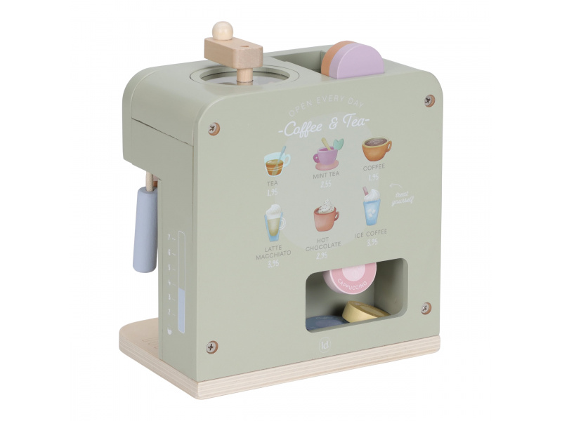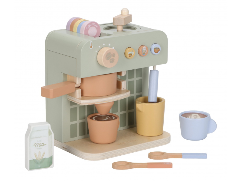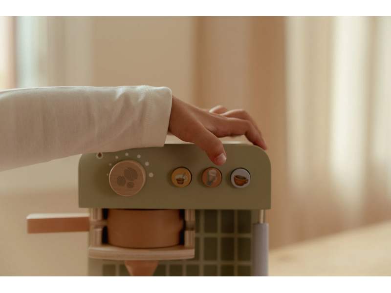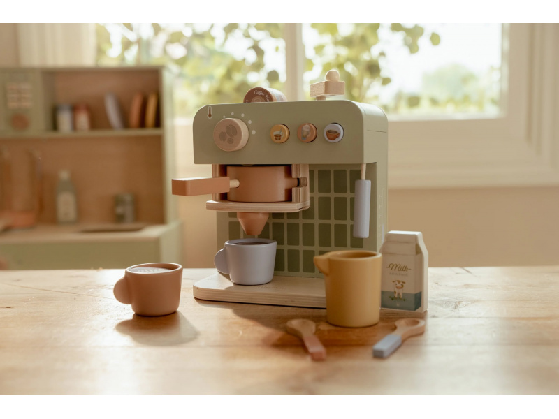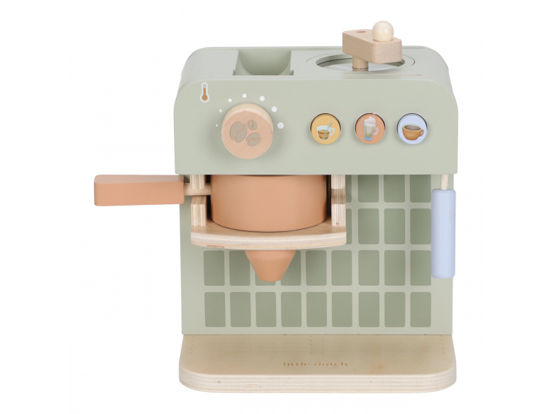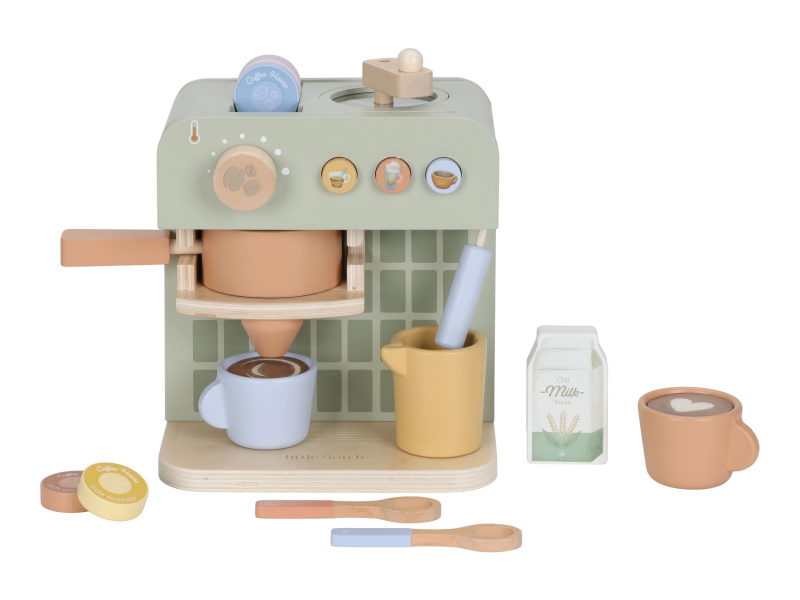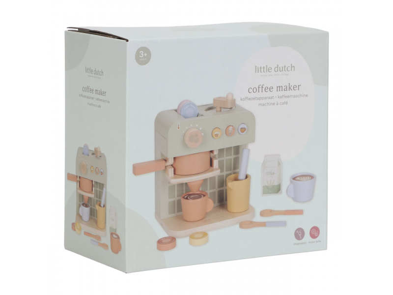 Na jakou kávu máte dnes chuť? S tímto krásným dřevěným kávovarem se z každého dítěte stane malý barista. Pro své hosty si může si namlít kávu, vybrat kapsli, nalít mléko a ozdobit nápoj podle vlastní fantazie. Bohate vybavenou sadu tvoří stylový kávovar, dvě hrnky, pět kávových kapslí, krabička mléka, džbánek, dvě lžičky a roztomilé šablony pro „latte art“. Na zadní straně kávovaru jsou veselé ilustrace, které dodávají hře další rozměr. Kávovar je skvělý doplněk k samostatně prodávané dětské kuchyňce nebo prodejnímu stánku Little Dutch. Je ideální pro hru na kavárnu, rodinnou snídani nebo přípravu kávy pro návštěvu. Podporuje představivost, kreativitu a jemnou motoriku dítěte a pomáhá rozvíjet jeho sociální dovednosti. Hračka je součástí kolekce vysoce kvalitních dřevěných hraček Little Dutch, navržených s důrazem na bezpečnost a originální design. Vyrobeno z odolného FSC certifikovaného dřeva. Rozměry: 23,1 × 24,2 × 13 cm Vhodné pro děti od 2 let.
