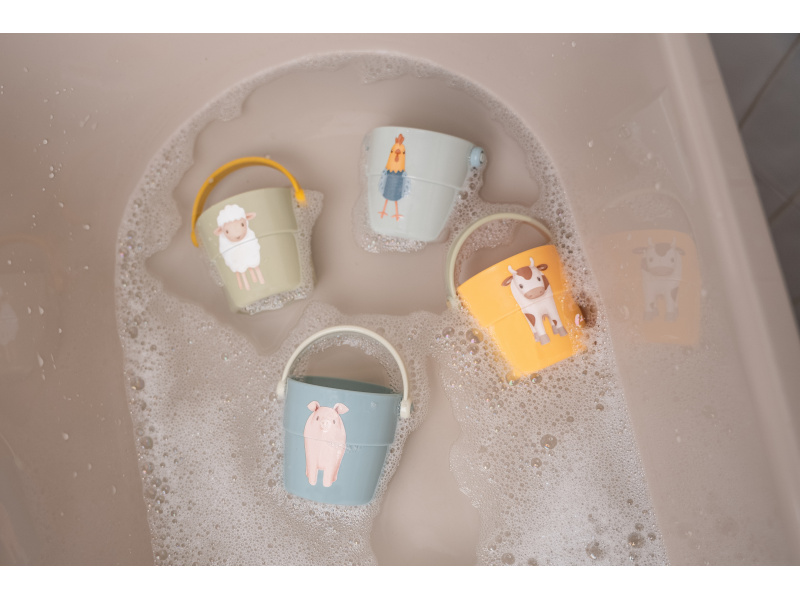 Čtyři malé kyblíčky s držadlem jsou krásným doplňkem do koupele, se kterým se koupání stane ještě zábavnější aktivitou. Jsou skvělé na přelévání vody, ale i na stavění a bourání věže při hraní na suchu. Kelímky v jemných pastelových barvách zdobí krásné ilustrace ze života na farmě. Hračka je součástí designové kolekce hraček Little Dutch Farma. Rozměry: 7 x 8 cm Vhodné pro děti od 18 měsíců.