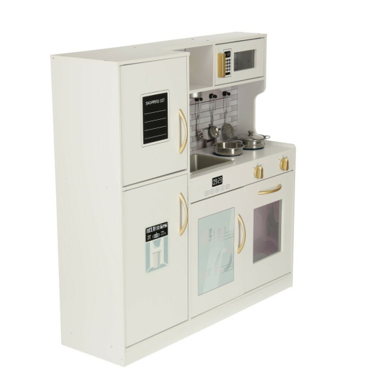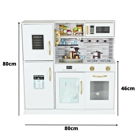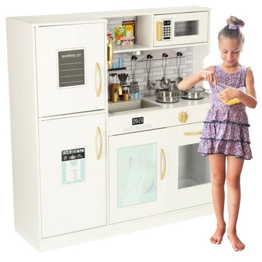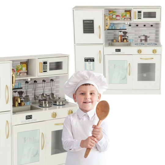 - Kuchyně je bílá a má zlaté prvky, díky nimž celý produkt dokonale zapadne do každé místnosti a poskytne nejen hrací plochu, ale také velkolepou dekoraci.