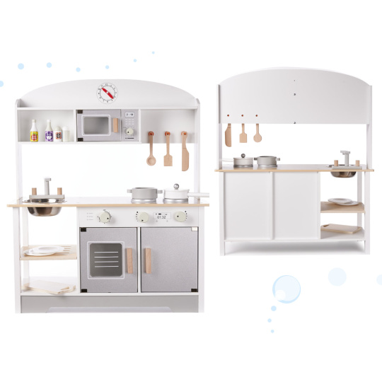 Všechny prvky (kromě dřezu) jsou dřevěné. Celá věc byla pečlivě obroušena a pokryta netoxickou barvou - to vše pro bezpečnost vašeho batolete.