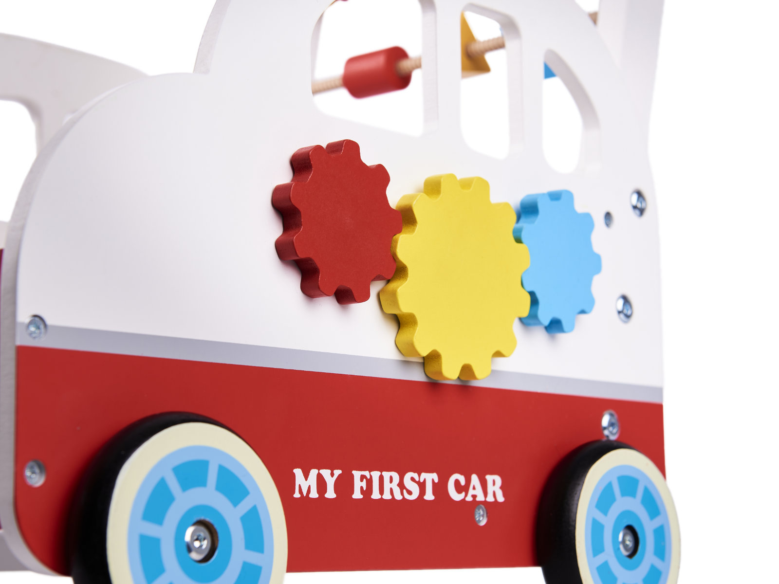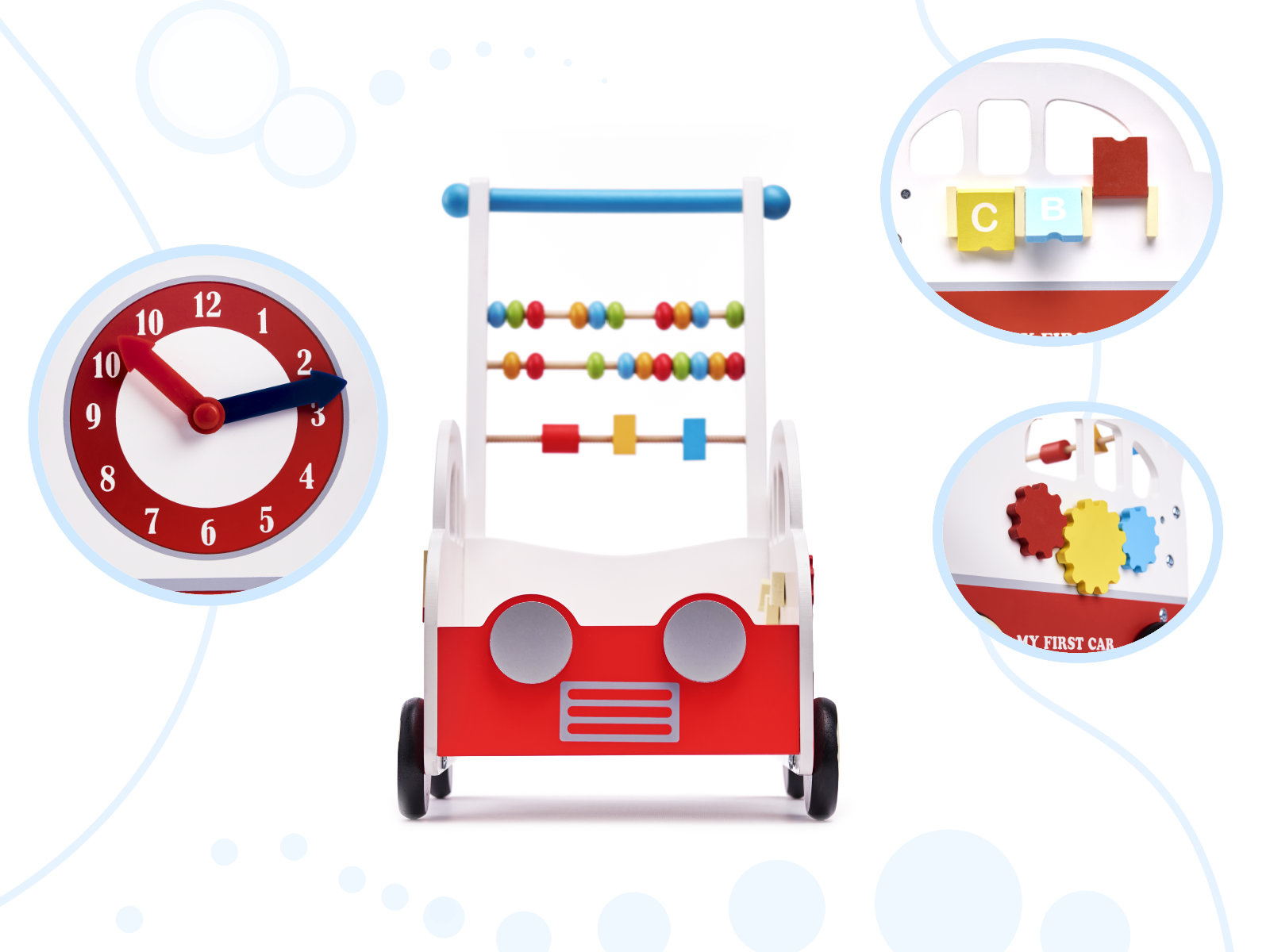 Kromě funkce posunovače/chodítka je hračka vybavena prvky, které stimulují hmat a rozvíjejí smyslovou integraci batolete: