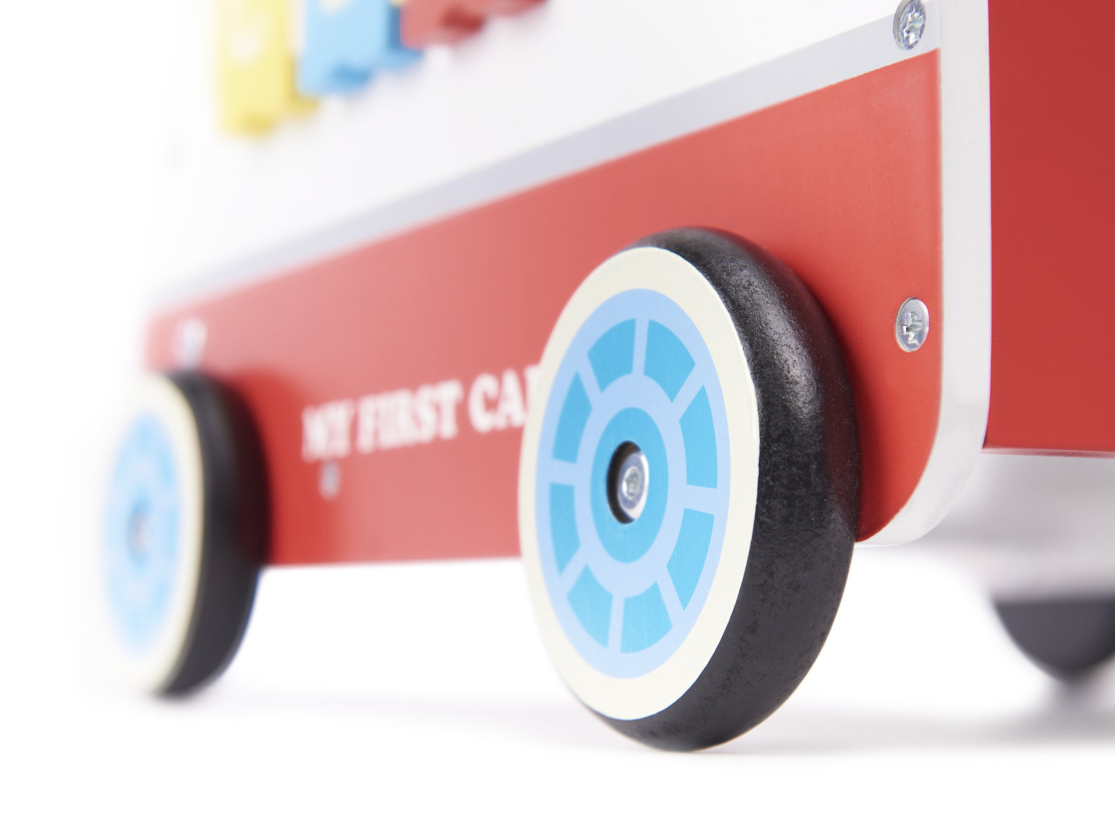 Design a výroba hračky potěší náročné rodiče i děti. Má dřevěné prvky a výřezy imitující boční okna nebo světla auta.