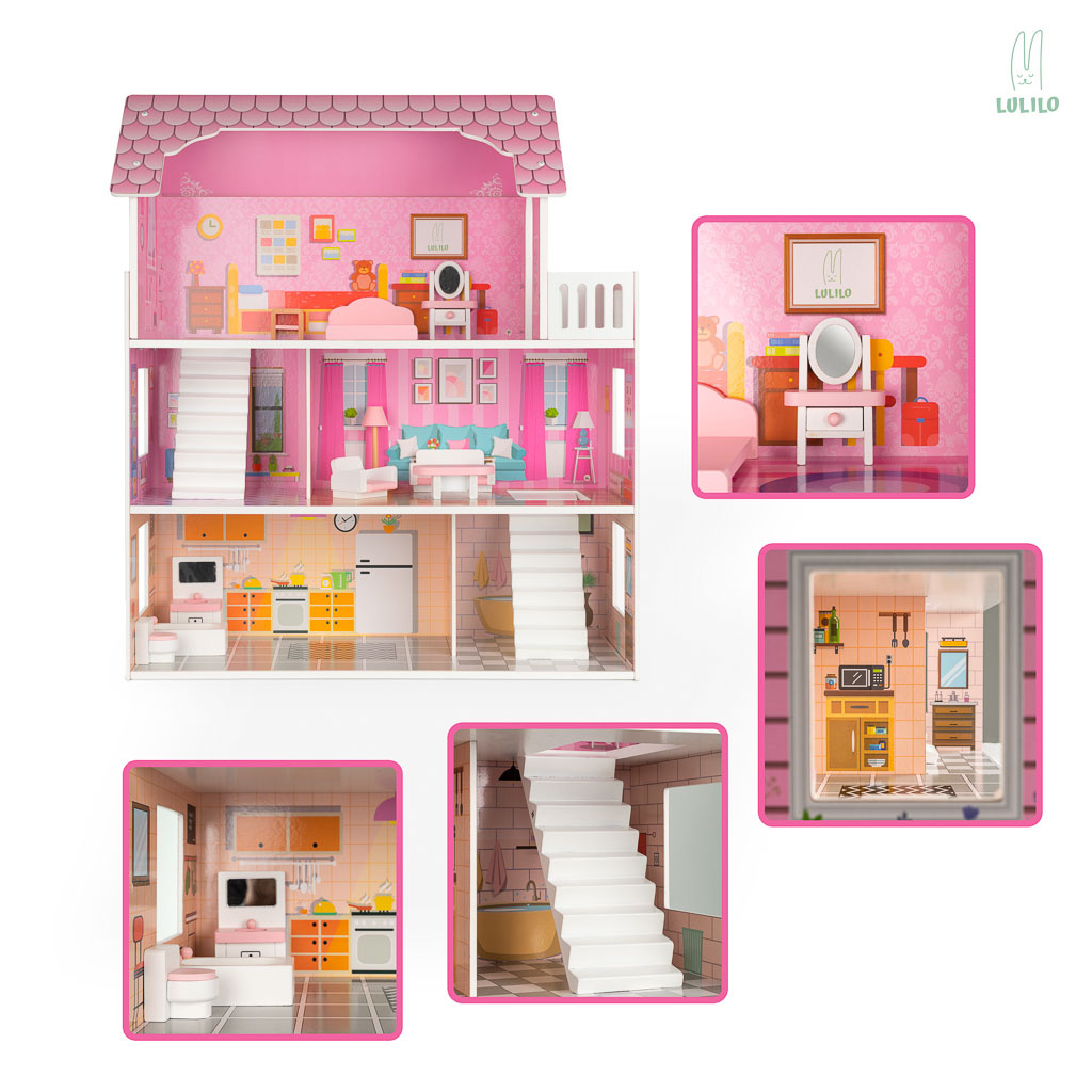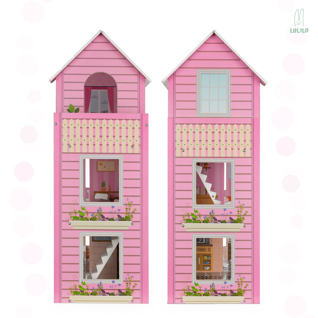 Dřevěný dům má tři podlaží a pět samostatných pokojů a terasu. Zní to jako ideální domeček pro všechny panenky.