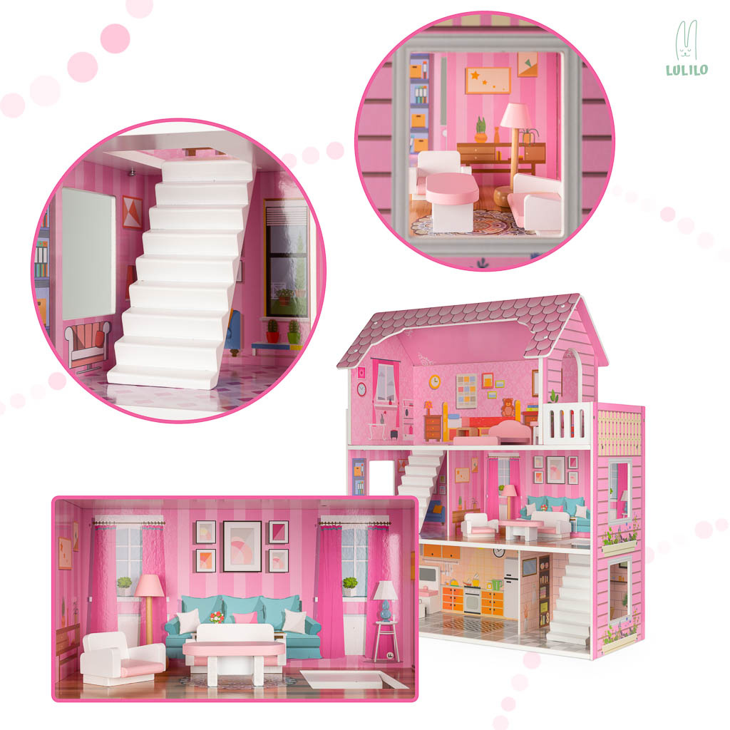 KIK Dřevěný domeček pro panenky Trikito 70 cm růžový + nábytek